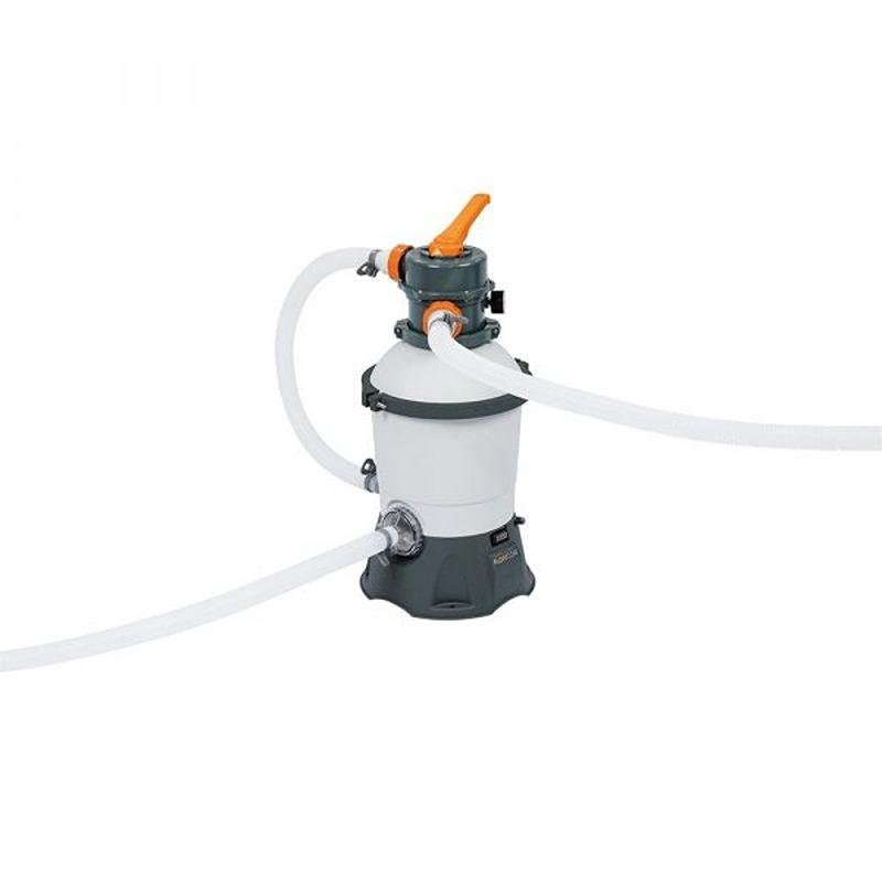 The Bestway BWAY SAND FILTER 800GAL (Model 58515) is a high-performance filtration system designed for above-ground pools holding 1,100-18,100 liters (300-4,800 gallons). This robust sand filter delivers a powerful pump capacity of 3,028 L/h (800 gallons/hour) with an integrated system flow rate of 2,271 L/h (600 gallons/hour), ensuring crystal clear water all season long. Measuring 48 x 48 x 64 cm and weighing 12.5 kg, the system features a durable, corrosion-resistant polyethylene tank that withstands harsh pool chemicals and UV exposure. The 6-position multiport valve offers easy control between filtration, backwashing, rinsing, recirculation, winterizing, and closed system operations. The included ChemConnect™ Dispenser automatically maintains proper chlorine levels, while the transparent top flange allows for quick sand level inspection and the 360° rotating collar simplifies installation. The easy-to-read pressure gauge indicates when backwashing is needed, and the large top-loading strainer basket efficiently captures leaves and debris before they reach the filter media. The system works with either traditional #20 silica sand (8.5 kg required, not included) or high-efficiency Polysphere® media for superior filtration down to 20-40 microns. The preassembled design reduces setup time, and the heavy-duty construction ensures years of reliable service. Standard 3.2cm (1.25") hose connections with proper threading make installation straightforward, while the thermal-protected motor prevents overheating during continuous operation. Perfect for medium to large above-ground pools, this sand filter system combines professional-grade performance with user-friendly features, including a convenient carry handle and smooth-rolling base for easy positioning. The efficient backwash function extends filter media life and reduces water waste, while the clear viewing window allows monitoring of water clarity. With its combination of power, durability, and smart features, the Bestway 800GAL sand filter provides superior water quality with minimal maintenance.