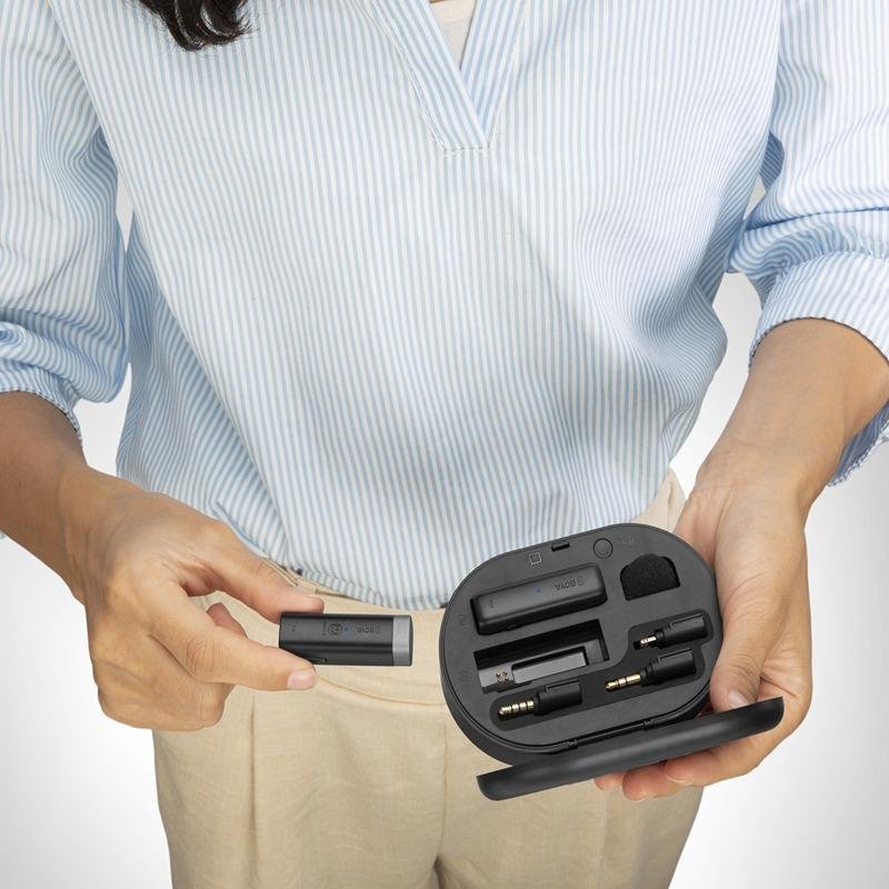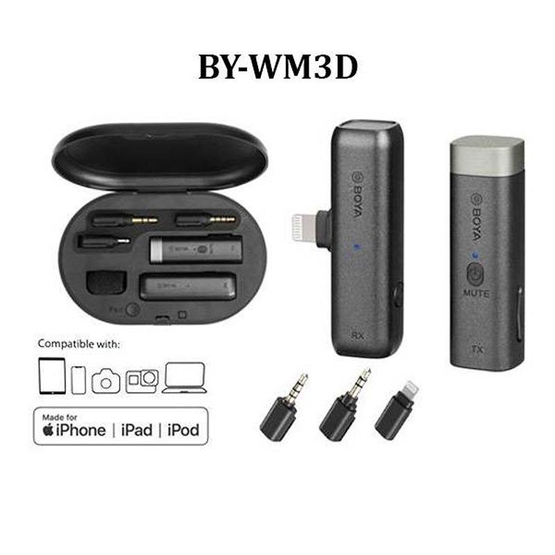 The Boya BY-WM3D Wireless Lavalier Microphone is an advanced 2.4G True Wireless mic designed for seamless audio capture across a range of devices, including iPhones, iPads, iPods, DSLRs, PCs, camcorders, and smartphones with 3.5mm input. This high-performance microphone is the perfect solution for daily vlogs, live streaming, interviews, and recording tasks. Featuring cutting-edge 2.4GHz transmission technology, the BY-WM3D delivers crystal-clear sound with low latency for professional-quality audio. The system includes an ultra-compact transmitter and receiver, which are easy to set up with a plug-and-play design, ensuring immediate usability. The microphone also comes with a convenient charging case that allows for both charging and pairing on the go. A built-in omnidirectional microphone ensures that sound is captured evenly from all directions, while the three interchangeable connectors for the receiver provide versatile compatibility with various devices. The system supports up to 4.5 hours of use for the transmitter and 8 hours for the receiver with a single charge, making it ideal for long sessions. Whether you're recording content for social media, conducting interviews, or live streaming, the BY-WM3D's small size and ease of use make it an essential tool for creators who demand portability without compromising on performance.