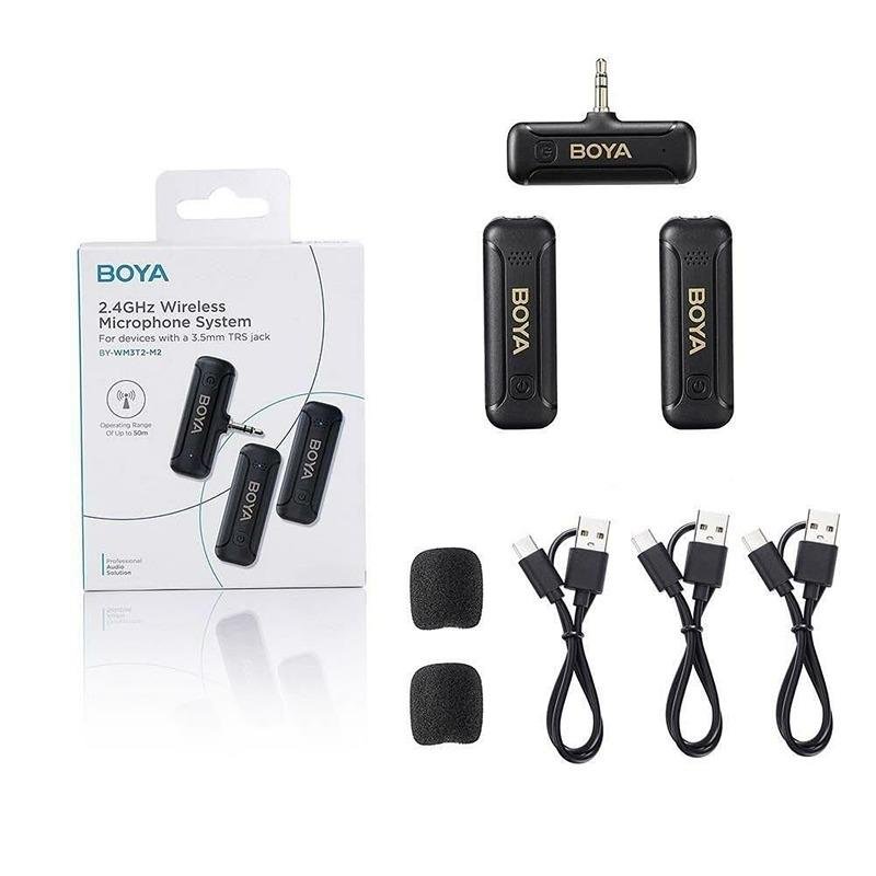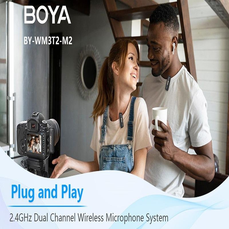 The Boya BY-WM3T2-M2 2.4GHz Dual-Channel Wireless Microphone System is a high-quality, compact audio solution designed for capturing professional-grade sound during various applications, including vlogging, live streaming, and interviews. This system offers a dual-channel design, enabling the simultaneous recording of two audio sources, perfect for interviews or multi-person content. Operating on a 2.4GHz wireless frequency, it ensures clear, low-latency audio transmission with a reliable range. The system features automatic pairing, simplifying setup and providing a seamless user experience right out of the box. The 2 transmitters and receiver are ultra-compact and lightweight, ensuring easy portability and flexibility during shoots. With up to 10 hours of battery life on a single charge, the BY-WM3T2-M2 is designed to last through long recording sessions, providing reliable performance throughout. The true-wireless design eliminates the need for cumbersome cables, offering enhanced freedom of movement. This microphone system is plug-and-play, making it user-friendly and suitable for content creators of all experience levels. It supports a variety of devices, including cameras, smartphones, and laptops, and is equipped with omnidirectional microphones for consistent sound capture from all directions. Whether you're a professional content creator or a beginner, the Boya BY-WM3T2-M2 offers an easy-to-use, high-performance wireless audio solution, making it an essential tool for anyone looking to create high-quality audio for their content.