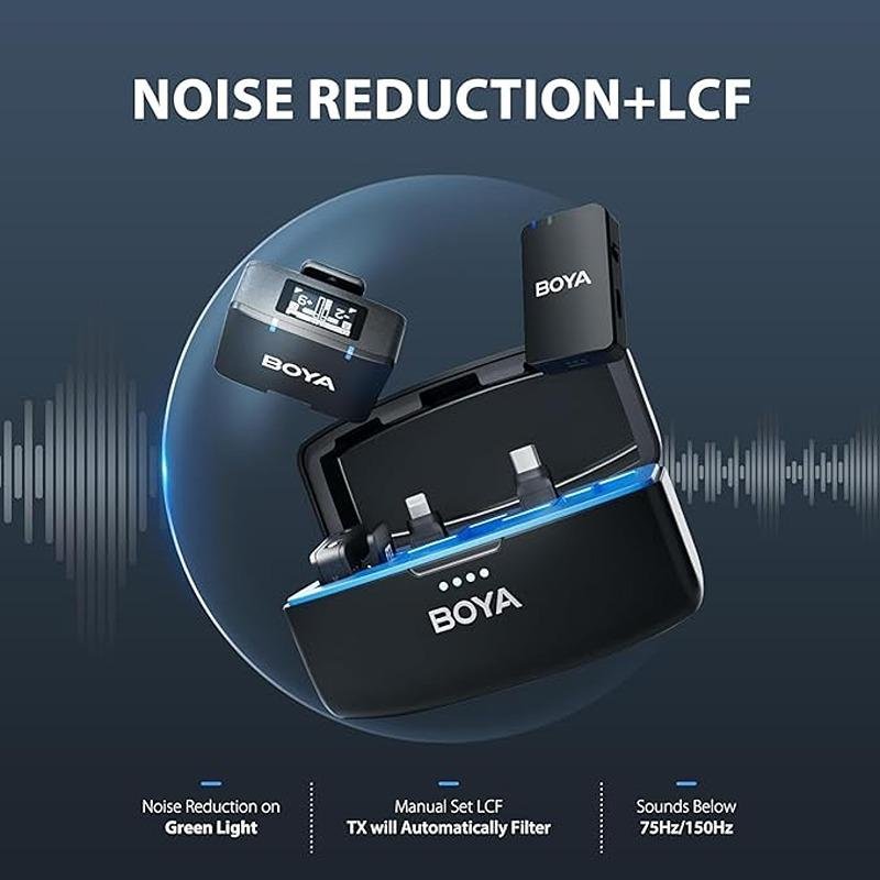 The Boya MIC 2.4GHz all-in-one professional wireless microphone system is designed to provide high-quality, wireless audio recording for a range of devices including cameras, iPhones, and Android phones. Offering seamless connectivity with 2.4GHz wireless technology, it ensures crystal-clear sound for vlogging, podcasting, interviews, and live streaming. The microphone system is easy to set up and features a user-friendly plug-and-play design, making it an excellent choice for both beginners and professionals. With a charging time of just 1.5 hours, the system offers a remarkable 22 hours of usage and 10 hours of continuous recording time, ensuring long-lasting performance during extended recording sessions. The built-in noise reduction feature enhances the audio quality, minimizing background interference and ensuring clean, professional-grade sound. Compatible with various devices, the Boya MIC is ideal for content creators on the go. Whether you're recording interviews, podcasts, or videos, this wireless microphone system provides the flexibility and convenience you need. Its compact design and lightweight build make it portable and easy to carry, while its reliable wireless range gives you the freedom to move around while maintaining excellent sound quality. This all-in-one microphone system is a powerful solution for anyone who needs high-performance wireless audio recording without the hassle of complicated setups.