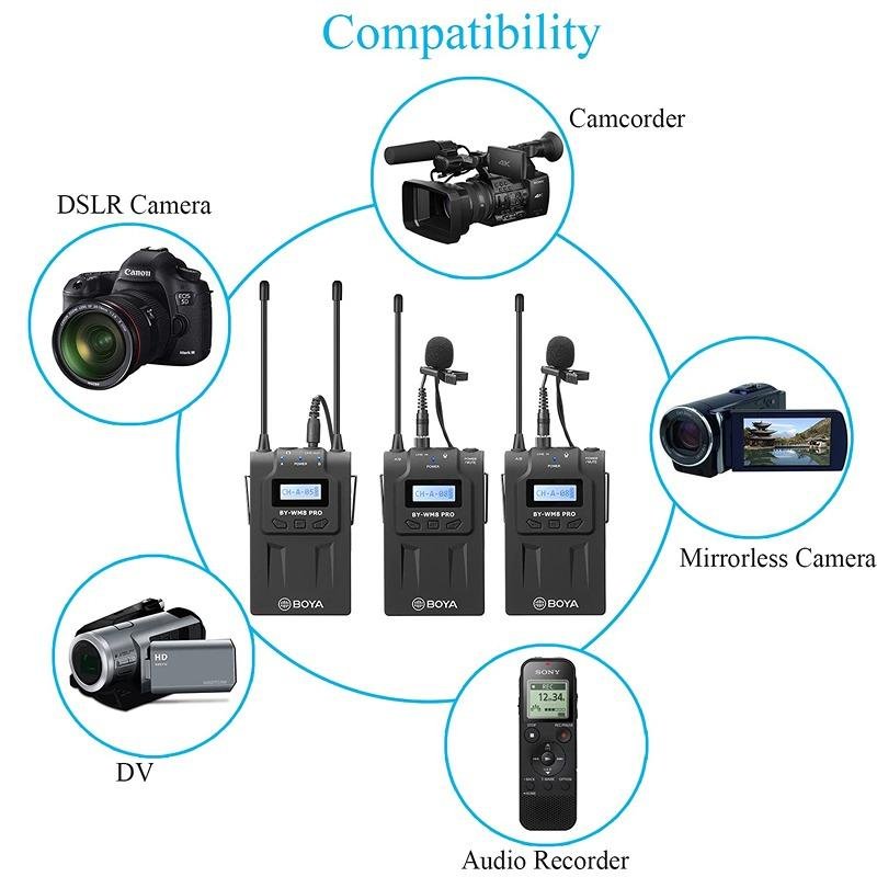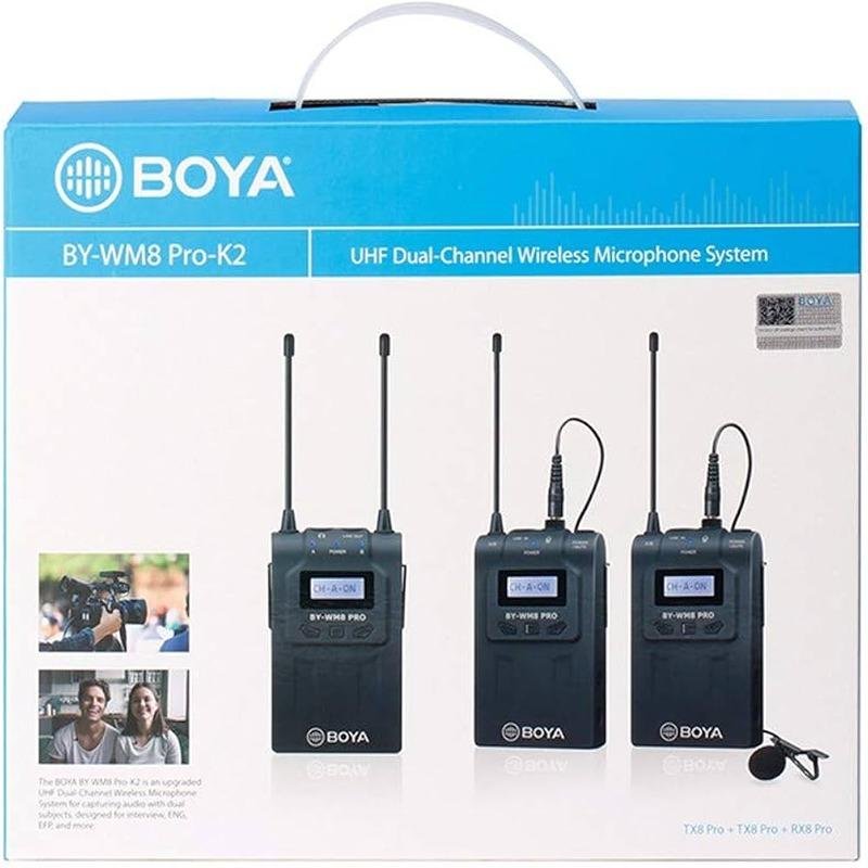 The Boya Wireless Lavalier Microphone System with 2 Bodypack Transmitters and 1 Portable Receiver (BY-WM8 Pro-K2) is an advanced UHF dual-channel wireless microphone system designed to deliver high-quality audio capture for a variety of applications, including live sound, ENG, broadcast, film, talk shows, conferences, and more. This upgraded version includes two bodypack transmitters, providing the flexibility to capture audio from two sources simultaneously. The system's digital companding circuitry ensures clear and professional sound, while the user-friendly menu offers more control options for customizing the settings. The Auto-Lock function is a key feature that prevents accidental changes to the settings during operation, ensuring consistent performance. The portable receiver has the added benefit of headphone monitoring, allowing users to check audio quality in real time. With a wide transmission range of up to 100 meters in open space, this system is ideal for both indoor and outdoor use. It is compatible with a wide range of devices, including Canon, Nikon, Sony, and Panasonic DSLR cameras, making it an excellent choice for filmmakers and content creators who require versatility and reliability in their wireless microphone setup. The BY-WM8 Pro-K2 also includes a variety of accessories that allow the system to adapt to various shooting environments, ensuring a seamless and efficient recording experience. Whether you're capturing interviews, filming documentaries, or recording podcasts, the Boya Wireless Lavalier Microphone System offers exceptional sound quality and ease of use, making it the perfect choice for professionals in need of a portable and reliable wireless audio solution.