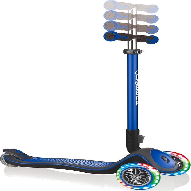 The GLOBBER ELITE DELUXE LIGHTS SCOOTER - NAVY BLUE - 444-400 brings an exciting, fun, and safe scooting experience to kids with its innovative features and vibrant design. Perfect for young riders aged 3 and up, this 3-wheel scooter is equipped with LED light-up front wheels that create a glowing trail as kids zoom along. Powered by kinetic energy, these battery-free LED lights add an extra layer of fun and visibility, making it ideal for evening rides. The scooter also boasts a Globber-patented elliptic folding system, which allows for easy storage and transport, making it convenient for parents and kids alike. For beginners, the scooter comes with a patented steering lock system that helps children learn how to steer with confidence by limiting the turning range. The 4-height aluminium T-bar ensures that the scooter grows with your child, offering four height settings for years of use. Its wide, dual-coloured scooter deck provides a stable and comfortable ride, while the reinforced construction supports up to 50 kg, making it suitable for kids as they continue to grow. At just 2.7 kg, the scooter is light enough for kids to maneuver but sturdy enough to handle regular use. Whether your child is scooting around the neighborhood or at the park, the GLOBBER ELITE DELUXE LIGHTS SCOOTER in sleek navy blue combines style, safety, and functionality in one high-quality package. Specifications: Product weight (net): 2.7 kg Maximum user weight: 50 kg Foldable: Yes, with elliptic folding system for easy storage Adjustable: Yes, with 4-height adjustable T-bar Age: Suitable for children aged 3 and older Steering: Patented steering lock system for easy learning Wheels: Battery-free LED wheels powered by kinetic energy Deck: Wide, dual-coloured scooter deck for comfort and stability Frame: Reinforced construction for durability Ideal for: Both indoor and outdoor use Features: LED light-up front wheels that glow as you ride Battery-free, kinetic-powered LED lights for convenience Globber-patented elliptic folding system for easy portability Patented steering lock system for smoother steering control 4-height adjustable aluminium T-bar for growing kids Wide, dual-coloured scooter deck for a comfortable ride Lightweight design at just 2.7 kg for easy maneuverability Supports up to 50 kg, ideal for children aged 3 and up Reinforced frame ensures durability and long-lasting use Sleek navy blue design that kids will love