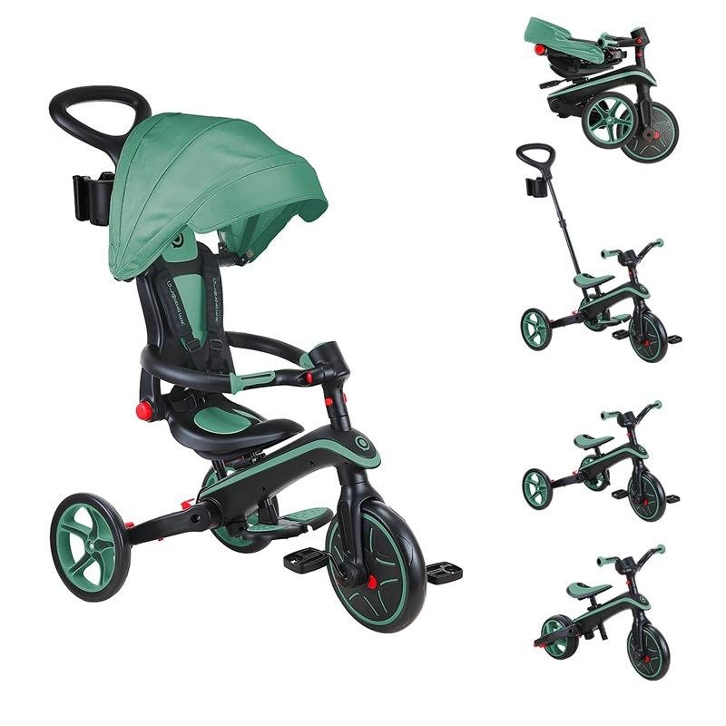 The GLOBBER FOLDABLE EXPLORER TRIKE TRICYCLE (4 in 1) in Olive is the perfect ride for toddlers aged 10 months to 5 years, designed to grow alongside your child with its versatile 4-in-1 design. This all-in-one tricycle offers four stages of use: Infant Trike (10-36 months), Guided Trike (18-36 months), Training Trike (24-36 months), and Balance Bike (2-5 years). As your child progresses, the trike transforms easily, without the need for tools, thanks to its patented wheel mechanism and tool-less design. In addition to its adaptability, the trike features a patented scissor folding system that allows for convenient storage and transport, making it easy to take on the go. The trike is equipped with a 2-height adjustable parent handle, ensuring ease of control and steering, and a 2-height adjustable saddle for a perfect fit as your child grows. The high-back seat and removable footrest provide added comfort and support in the early stages, while the smart handlebars and EVA foam wheels ensure a smooth and stable ride. With its foldable components and compact design, the EXPLORER TRIKE is ideal for families on the go, providing both functionality and portability. Whether you're going for a stroll in the park or taking a trip, this foldable tricycle offers endless opportunities for fun and development, helping your little one build balance, coordination, and confidence as they explore the world around them.