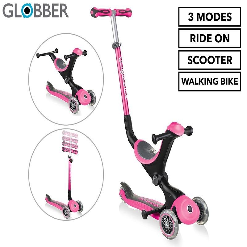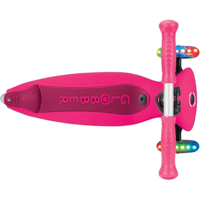 The GLOBBER GO•UP ACTIVE LIGHTS SCOOTER in Dark Pink is the perfect companion for your child's outdoor adventures. This versatile scooter transforms easily into a ride-on, walking bike, and scooter, growing with your child from 15 months to 9+ years. The patented 360° parent steering offers effortless control in ride-on mode, ensuring smooth and safe steering for both you and your little one. With a 100% tool-less design, you can switch between modes without any hassle. The scooter also features an adjustable seat and T-bar to accommodate your child’s growth, while the durable deck provides a stable and secure platform for riding. Its battery-free LED light-up wheels add excitement and visibility, making playdates even more fun. The patented folding and steering lock system ensures easy storage and transport, and the scooter is crafted from 34% Global Recycled Standard (GRS) plastic, promoting sustainability. Whether your child is in ride-on mode or zooming around in scooter mode, the GO•UP ACTIVE LIGHTS ensures endless playtime while encouraging the development of balance and coordination. With a robust design, a long-lasting build, and a fun, eco-friendly construction, this scooter will be a reliable partner for years to come.