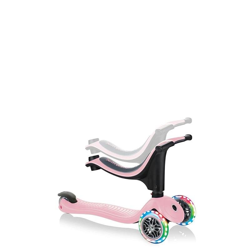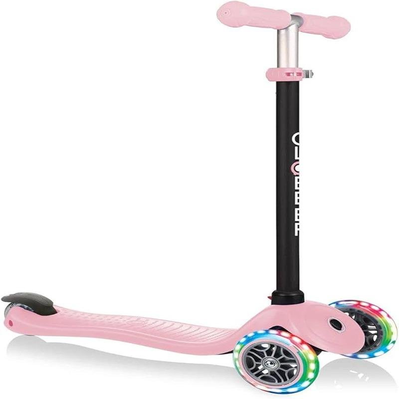 The GLOBBER GO•UP SPORTY LIGHTS SCOOTER in Pastel Pink is the perfect multi-functional ride for your growing child, designed to evolve alongside them from toddler to kid. This 3-wheel scooter offers a seamless transition between ride-on, walking bike, and toddler scooter modes, catering to kids from 15 months to 7+ years. In ride-on and walking bike modes, it's ideal for toddlers aged 15-36 months, while the scooter mode suits children aged 3-7+. The scooter features a patented steering lock system, making it easy for toddlers to learn to steer, and ensures maximum safety during the early stages of riding. The adjustable seat and T-bar grow with your child, providing long-lasting use. The sturdy, durable deck ensures stability and comfort, while the LED light-up wheels add an extra layer of excitement. With no batteries required, the light-up feature provides a magical touch with every roll. Crafted with 35-38% Global Recycled Standard (GRS) plastic, this scooter promotes sustainability and helps create a circular economy by using recycled materials such as bottles, cups, fish nets, and old toys. The GLOBBER GO•UP SPORTY LIGHTS is not only a great choice for your child but also a step towards reducing environmental impact. Recognized by The National Parenting Center with the Seal of Approval, this scooter ensures your child’s safety, fun, and eco-conscious play. Designed for endless playdates and endless fun, this scooter is a reliable companion for both outdoor adventures and everyday rides.