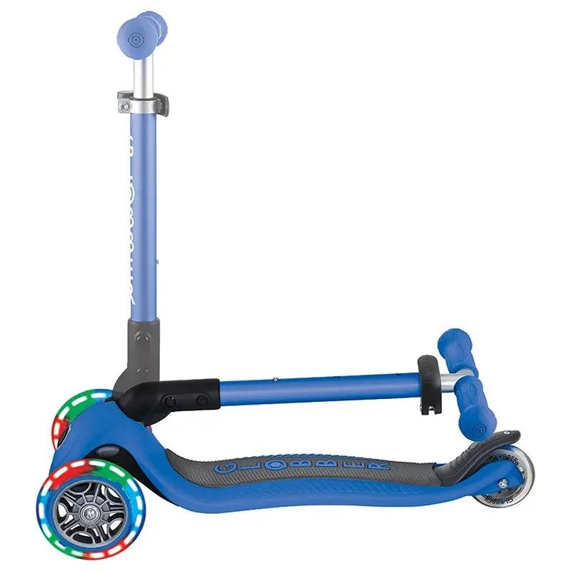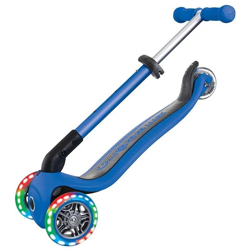 The GLOBBER JUNIOR FOLDABLE LIGHTS SCOOTER in Navy Blue is the perfect scooter for toddlers starting their scooting adventures at just 2 years old. This 3-wheel scooter is specially designed for young riders, offering a stable and secure ride with a low, wide deck to ensure maximum balance and comfort. Featuring a patented steering lock system for added control, the scooter also includes a folding mechanism with a push button for easy storage and portability, making it perfect for on-the-go families. The adjustable T-bar allows the scooter to grow with your child, offering a customizable ride as they develop. One of the most exciting features of the JUNIOR FOLDABLE LIGHTS is the battery-free LED light-up wheels, which flash in vibrant colors as the scooter moves, adding an element of fun and visibility. The faster your little one scoots, the brighter the lights glow! Made from 25-28% Global Recycled Standard (GRS) certified plastic, this scooter is also environmentally friendly, helping reduce waste while providing a safe and fun experience for toddlers. With its lightweight design (just 2.46 kg) and thoughtful features, the GLOBBER JUNIOR FOLDABLE LIGHTS SCOOTER is the perfect way for toddlers to start their scooting journey, developing balance, coordination, and confidence.
