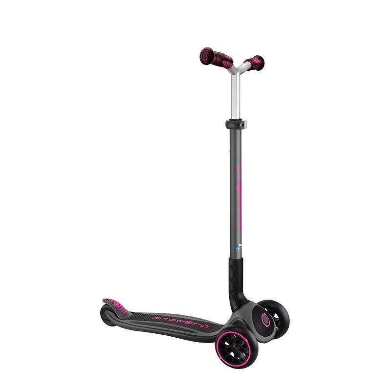 The GLOBBER MASTER PRIME SCOOTER in Deep Pink/Black is the ultimate ride for kids aged 4 to 14 years, offering the perfect blend of style, comfort, and durability. Designed with a wide, curved handlebar that adjusts to five different heights, this scooter grows with your child for maximum long-term use. The soft ergonomic grips ensure a comfortable and secure hold, even on longer rides. With an extra-wide deck featuring a non-slip EVO coating, the scooter provides excellent stability and control. The high-quality 125mm front polyurethane wheels (38mm wide) and an 80mm rear wheel ensure smooth and comfortable rides on various terrains. The MASTER PRIME is built to handle up to 50kg of weight, providing robust durability and safety. Additionally, it features a patented folding system, which allows you to easily fold the scooter with a simple button press on the deck for convenient storage and transportation. Whether for everyday commuting or recreational use, the MASTER PRIME is the perfect scooter for kids who need reliability, comfort, and a touch of fun.