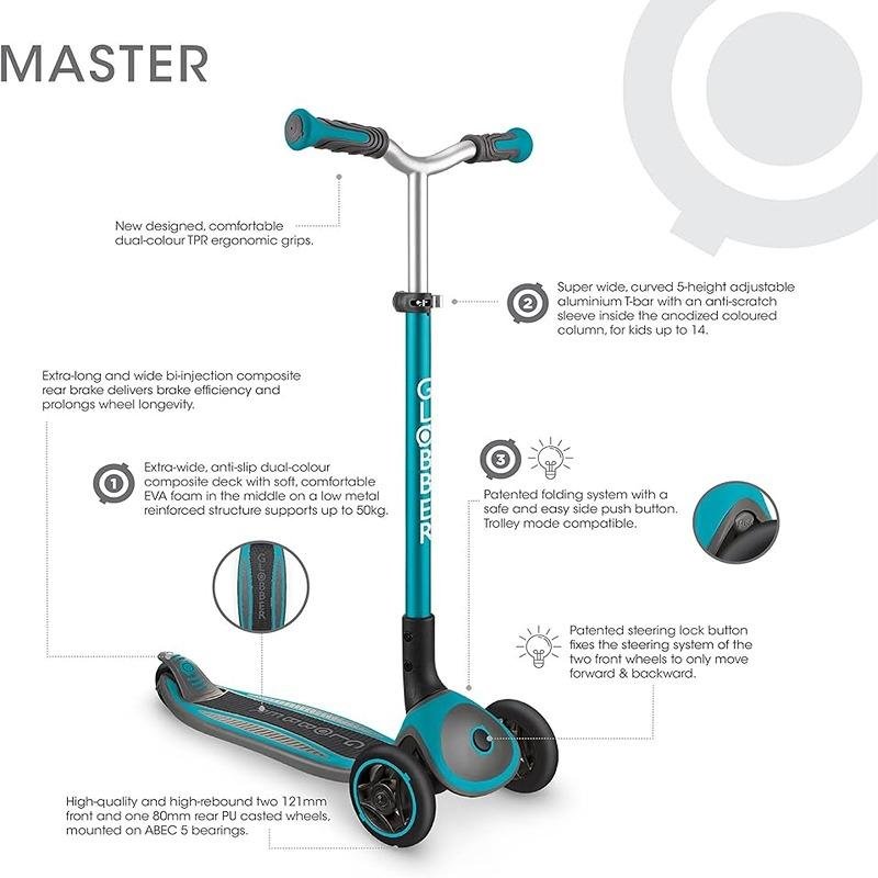 The GLOBBER MASTER SCOOTER - TEAL - 660-105 is the perfect scooter for kids aged 4 to 14, combining safety, comfort, and style for a fun scooting experience. Designed to grow with your child, this scooter features a 5-height adjustable T-bar, ensuring that it can be used comfortably for several years as your child grows taller. The extra-wide, curved handlebars offer added control and comfort, making it easier for young riders to handle the scooter with confidence. Equipped with a premium anti-slip EVA foam deck, the scooter provides a secure and comfortable ride, preventing slipping and offering superior grip. The 3-wheel design enhances balance and stability, making it easier for younger riders to master their scooting skills. The scooter also features a patented push-button folding system, allowing for easy folding and storage, perfect for when you're on the go or when the scooter needs to be packed away. With a weight of just 2.79 kg, the GLOBBER MASTER SCOOTER is lightweight yet durable, supporting riders up to 50 kg. Its extra-wide deck ensures a stable ride, and the scooter’s overall design makes it a great choice for children who are just learning to scoot or those who are looking to upgrade to a more advanced scooter. The teal color adds a modern and vibrant touch, making it an attractive option for kids. Whether your child is scooting through the park or navigating around the neighborhood, the GLOBBER MASTER SCOOTER ensures a smooth, comfortable, and safe ride.