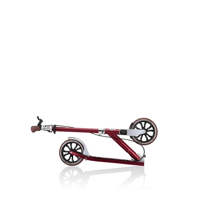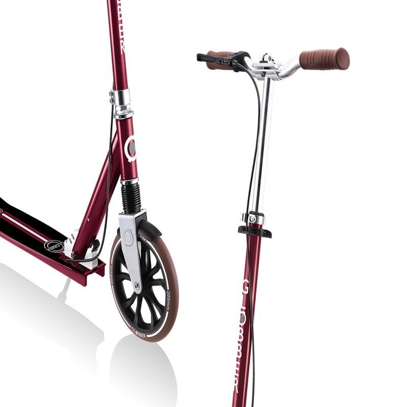The GLOBBER NL500-205 DELUXE Scooter - High Gloss Burgundy is the ultimate combination of style, comfort, and performance, designed for teens and kids aged 8+ who love cruising around the city in style. With its eye-catching high gloss burgundy finish, this scooter is perfect for those who want to make a statement while enjoying a smooth, efficient ride. The 205mm big wheels offer an excellent balance between speed and stability, making it easy to glide over city pavements and rougher surfaces. Thanks to the front suspension, the ride is exceptionally smooth, absorbing shock and providing greater comfort even on uneven terrain. This deluxe scooter features dual brakes—a rear foot brake and a handlebar brake—for enhanced safety and control while stopping. The robust aluminium deck comes with anti-slip grip tape, ensuring both durability and stability. With Globber’s patented folding system, you can easily fold and store the scooter when not in use. The scooter is also equipped with a 3-height adjustable T-bar, allowing it to grow with your child, providing long-lasting enjoyment. Whether your child is commuting to school, zooming through the park, or simply out for a fun ride, the NL500-205 DELUXE offers both practicality and style for every urban adventurer.