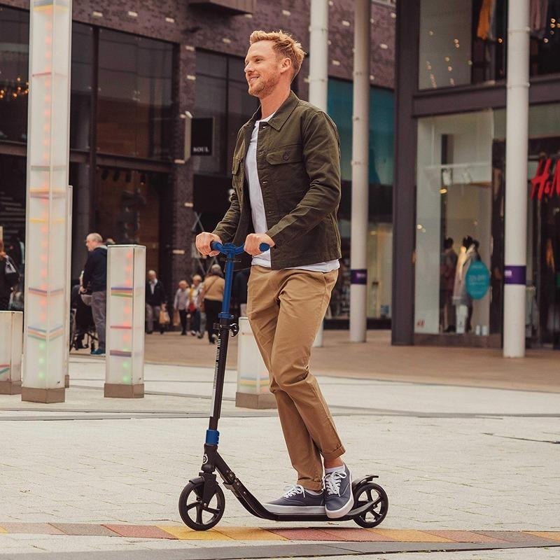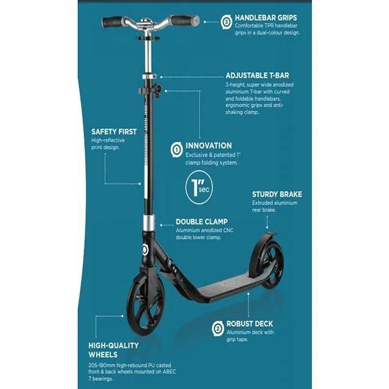 The GLOBBER ONE NL 205-180 DUO SCOOTER - COBALT BLUE - 474-101 is the ultimate urban scooter for teenagers and adults looking for convenience, comfort, and style in one ride. Designed for individuals aged 14+ and ranging from 155 to 200cm in height, this large scooter stands out with its patented 1-second folding system, allowing users to quickly switch between standing and folding mode. The aluminum deck with sandgrip provides a wide and sturdy surface, offering stability and comfort for longer rides. Featuring 205mm front wheels and 180mm rear wheels, both crafted from high-rebound PU-casted material, the scooter delivers a smooth ride over various surfaces, making it perfect for city commutes. The 3-way adjustable aluminum handlebar allows for personalized height adjustments, ensuring a comfortable riding experience. The mechanical rear brake made of aluminum provides reliable stopping power for added safety. At just 4.94kg, this scooter is both lightweight and robust, supporting up to 100kg of rider weight. When it’s time to store or transport, the foldable handlebar makes it easy to pack up, while the self-standing feature lets it stand independently when not in use. Whether for commuting, cruising, or casual rides, the ONE NL 205-180 DUO is designed for those who need a reliable, high-performance scooter with minimal hassle and maximum convenience.