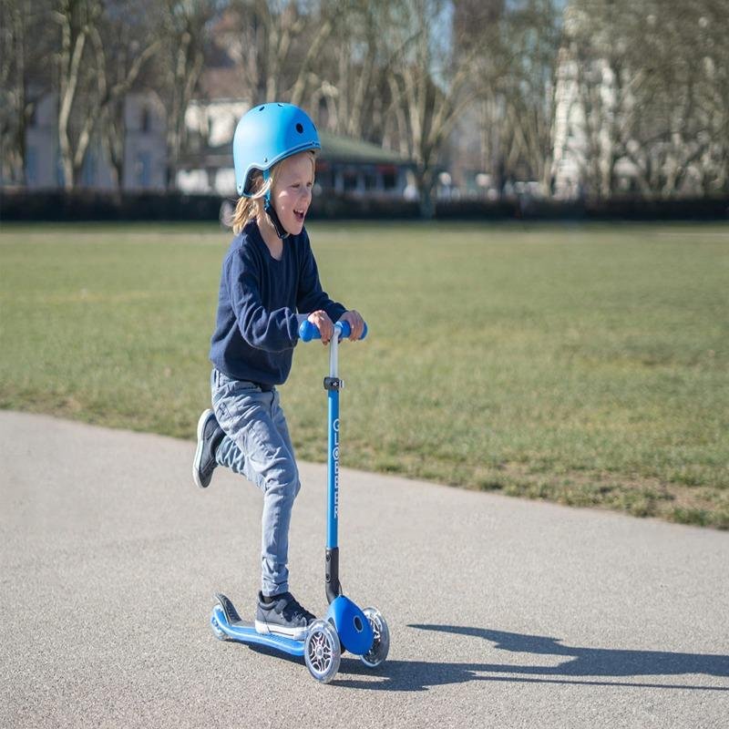 The GLOBBER PRIMO FOLDABLE FANTASY LIGHTS - NAVY BLUE/RACING - 434-100 is a dynamic, fun, and safe scooter designed for kids aged 3 and up, offering both style and functionality in one compact design. This 3-wheel foldable scooter features a patented push-button folding system, making it quick and easy for parents to store or carry when not in use. The wide deck, equipped with an anti-slip surface, provides extra grip and stability, giving children the confidence to ride. Constructed with a reinforced metal body frame, the scooter is built to last and withstand the rigors of daily use. Safety is a top priority, with an extra-large, integrated brake that ensures smooth and easy stopping, even for younger riders. The scooter's 3-height adjustable T-bar is ideal for growing children, allowing it to be adjusted to the appropriate height for kids aged 3 to 7, and it can support up to 50 kg, ensuring years of enjoyment. Adding an element of fun, the scooter is equipped with LED lights in the wheels, which not only create a magical effect as the scooter moves but also enhance visibility, making it safer to ride in low-light conditions. The striking navy blue and racing design is perfect for kids who love adventure and will make them the center of attention while riding. At just 2.5 kg, the scooter is light enough for kids to handle, while the durable construction ensures it can stand up to regular outdoor play. Whether your child is new to scooting or an experienced rider, the GLOBBER PRIMO FOLDABLE FANTASY LIGHTS offers a safe, fun, and stylish way to get around.