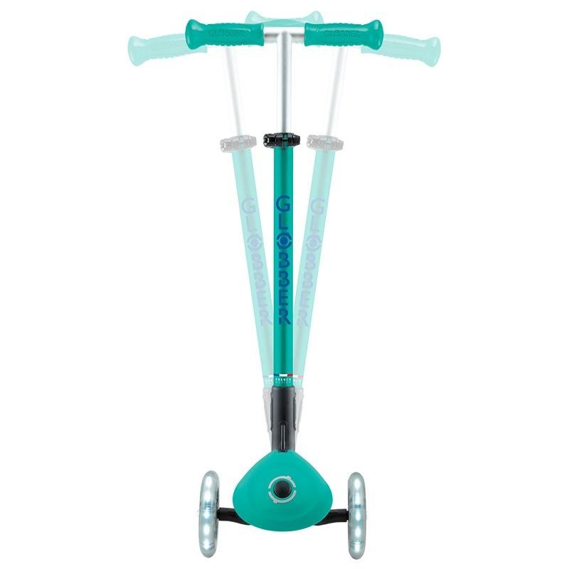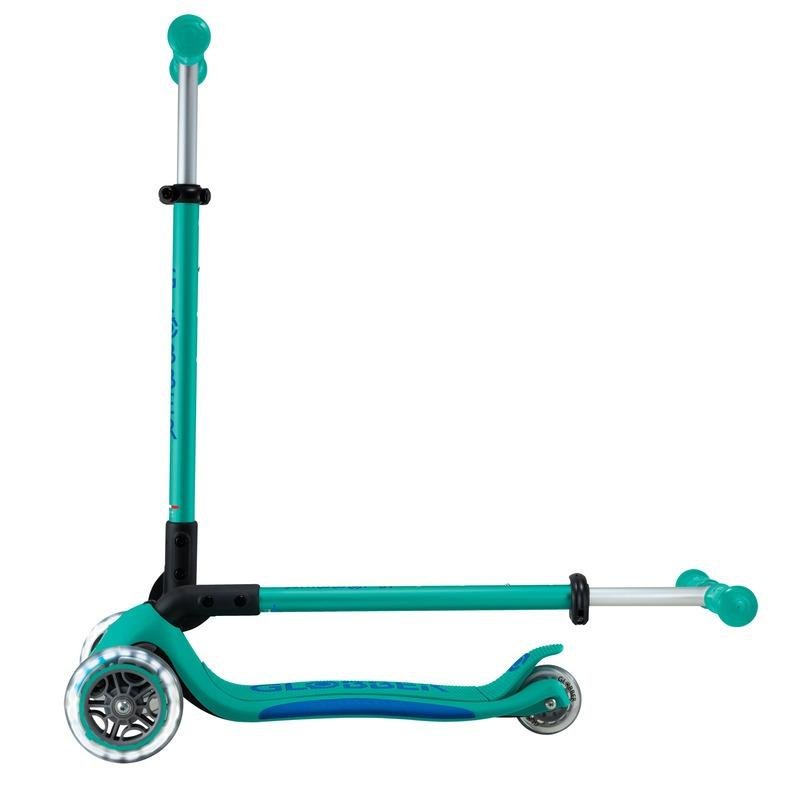 The GLOBBER PRIMO FOLDABLE PLUS LIGHTS scooter in Emerald Green/Navy Blue combines fun and functionality, offering a durable and exciting ride for children aged 3-7+. This three-wheel scooter features vibrant LED light-up wheels that flash in red, green, and blue, creating a glowtastic effect that brightens as your child rides faster. Powered by a dynamo, the lights require no batteries. The scooter is equipped with a patented folding system that allows for easy storage and portability, simply by pressing a button located at the bottom of the steering column. The three-height adjustable T-bar is made of anodized aluminum, providing comfort and convenience as the scooter grows with your child. The ergonomic TPR handles ensure a secure and comfortable grip for little hands. The scooter also comes with a patented wheel lock button, which locks the front wheels to forward and backward motion, helping children focus on balancing. Once they master this, the button can be unlocked, allowing for lean-to-steer turning. Built for durability, the scooter includes a reinforced metal structure, a non-slip, two-color composite deck, and an extra-wide brake for enhanced stopping power. Capable of supporting up to 50 kg, this scooter is perfect for everyday play and outdoor adventures, offering both safety and excitement for young riders.