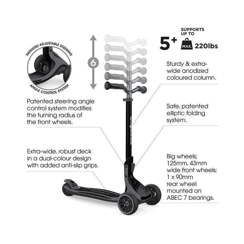 The GLOBBER ULTIMUM SCOOTER - CHARCOAL GREY - 612-120 is a versatile and high-performance 3-wheel scooter designed to meet the needs of both adults and children. It features a patented adjustable steering angle control system, allowing riders to easily customize the turning radius of the front wheels for a personalized riding experience. Whether you prefer tighter turns or smoother, wider arcs, this feature makes the ULTIMUM incredibly adaptable for a variety of riding styles and environments. The scooter also boasts a patented elliptical folding system, making it easy to store and transport, perfect for those on the go. With a sturdy, wide deck, it offers excellent stability and comfort, ensuring a smooth ride even on uneven surfaces. The 6-height adjustable T-bar accommodates riders of different sizes, from children as young as 3 to adults, providing long-term usability as it grows with your child. Designed to support up to 100 kg, the ULTIMUM scooter is incredibly durable, making it suitable for everyday use by both kids and adults. At 4.62 kg, it remains lightweight and easy to maneuver, while still being strong enough for longer rides. The sleek charcoal grey color gives it a modern, stylish look, making it ideal for urban commuting or casual recreation. Whether for short trips around the city or a fun ride at the park, the GLOBBER ULTIMUM SCOOTER delivers an exceptional riding experience that’s both practical and enjoyable for riders of all ages.