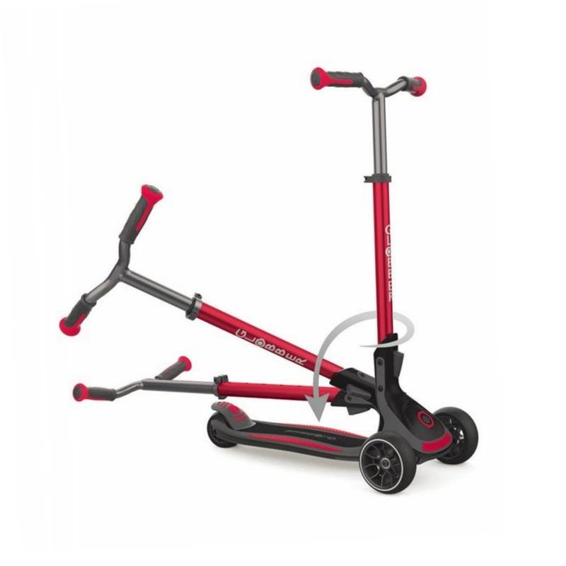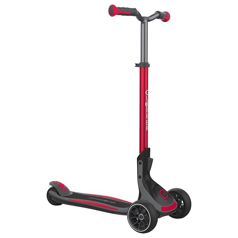 The GLOBBER ULTIMUM SCOOTER in New Red is a cutting-edge scooter designed for both performance and convenience. With its patented adjustable steering angle control system, this scooter provides a smoother, more customizable riding experience, ensuring optimal maneuverability and control. The high-performance 3-wheel design features large 125mm diameter front wheels, with a 43mm width, providing excellent stability and a smooth ride on various surfaces. The 6-height adjustable T-bar ensures comfort and adaptability for riders of all ages, making it a perfect scooter for growing children or adults. The wide scooter deck offers a comfortable and stable platform, supporting riders up to 100kg, making this scooter suitable for all ages and weights. Its patented elliptic folding system allows for quick and easy storage and transport, while the convenient trolley mode makes it simple to carry when on the go. Weighing just 4.62 kg, the GLOBBER ULTIMUM is lightweight yet durable, making it easy to handle and store. Whether you're commuting or enjoying recreational rides, the GLOBBER ULTIMUM SCOOTER in New Red combines style, performance, and practicality, offering an exceptional ride for years to come.