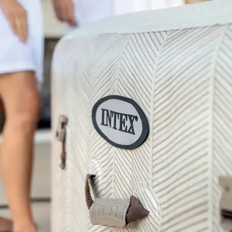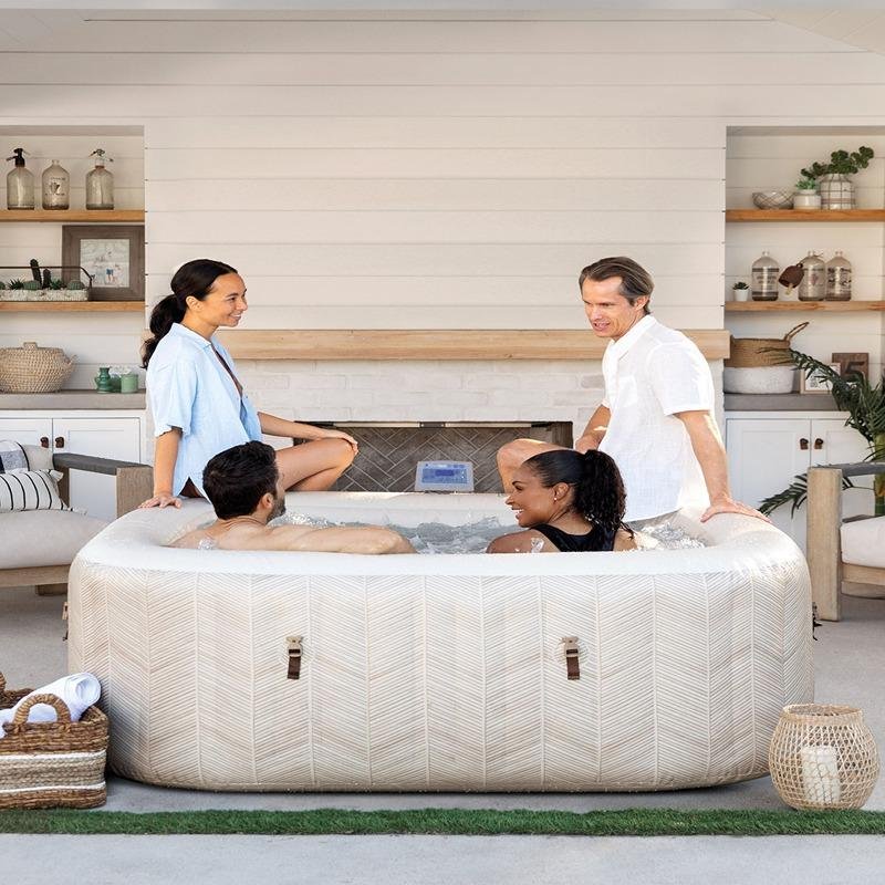 The Intex 4-Person Chevron Deluxe Square Bubble Spa Set (Model 28446) offers a unique combination of luxury, comfort, and advanced technology, making it the perfect choice for those seeking a spa experience at home. Designed to accommodate up to four people, this inflatable spa boasts 140 powerful bubble jets that deliver a soothing and invigorating massage to help you relax and unwind. The spa features a distinctive chevron-striped pattern that adds a modern and stylish touch to your outdoor or indoor space. Constructed with SuperTough™ 3-ply PVC material, it is built for long-lasting durability and resistance to punctures. The spa is equipped with dual water treatment systems: an electronic hard water treatment system and a natural chlorine saltwater system, ensuring soft, clean, and gentle water for a more enjoyable soak. With a temperature range from 10°C to 40°C, you can easily adjust the water to your preferred comfort level using the removable wireless control panel or the mobile management app, offering convenience and control from anywhere. The integrated FastFill™ inflation system makes setup quick and easy, while the Fiber-Tech™ technology enhances the spa's strength and stability, ensuring it remains sturdy and supportive. Whether you're relaxing solo, enjoying time with family, or entertaining friends, the Intex Chevron Deluxe Square Bubble Spa provides a spa-like experience in the comfort of your own home, all at an affordable price.