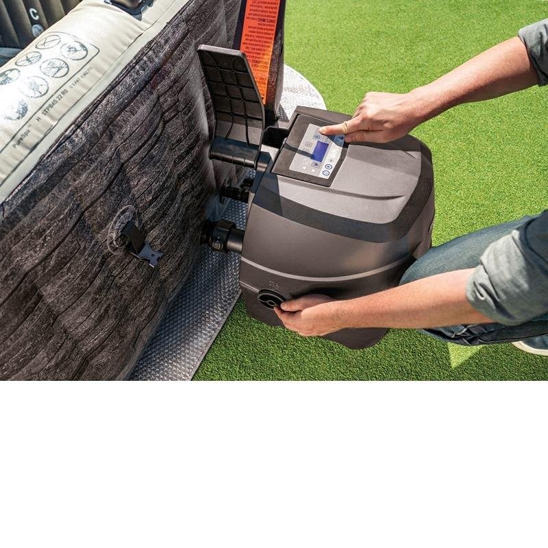 The Intex 4-Person Greystone Deluxe Square Bubble Spa Set (Model 28450) offers an exceptional spa experience, combining modern style with top-of-the-line features. Designed to fit four people comfortably, this spa features 140 powerful bubble jets that provide a soothing, invigorating massage, perfect for relaxation after a long day. The elegant greystone print and square shape make it a versatile addition to any backyard, patio, or even indoor space, blending seamlessly with both modern and classic environments. With a water capacity of 795 liters, the spa ensures ample room for everyone to enjoy. Equipped with advanced technology, it includes dual water treatment systems: an electronic hard water treatment system and a natural chlorine saltwater system, ensuring the water remains soft, clean, and comfortable. The temperature range of 10°C to 40°C allows you to easily adjust the water to your preferred level of warmth, and the wireless control panel, along with the mobile management app, lets you control your spa from anywhere for added convenience. The integrated QuickFill™ inflation system makes setup quick and easy, while the durable SuperTough™ 3-ply PVC material ensures long-lasting use. Fiber-Tech™ technology provides superior strength and stability, making the spa sturdy and reliable. For extra comfort, the spa comes with two premium PU foam headrests, and to set the perfect mood, it includes a multi-color changing LED light. Whether you're unwinding alone, enjoying a quiet evening with a partner, or hosting a small gathering, the Intex Greystone Deluxe Square Bubble Spa provides a luxurious and affordable way to enjoy a spa experience at home.