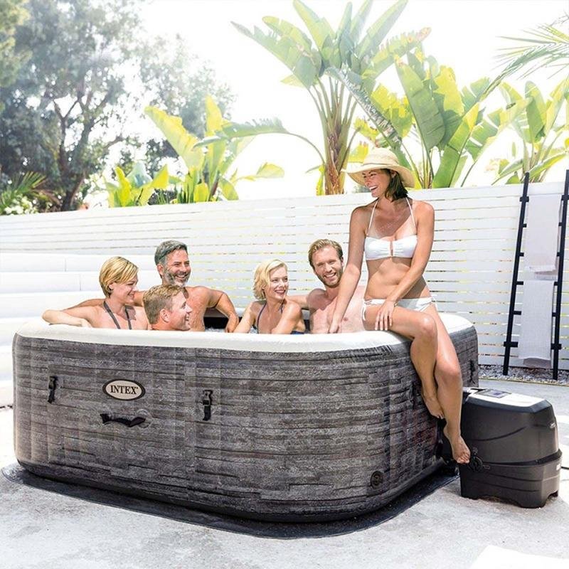 The Intex 6-Person Greystone Deluxe Square Bubble Spa Set (Model 28452) brings a luxurious spa experience into the comfort of your own home. Designed to accommodate up to six people, this spa features 170 bubble nozzles that provide a soothing and invigorating massage, perfect for relaxing after a long day or enjoying time with family and friends. The elegant greystone pattern combined with the square shape gives it a stylish and versatile look, seamlessly blending with both modern and classic environments. With a water capacity of 1,098 liters, there is plenty of room for everyone to enjoy a truly comfortable soak. The spa is built with SuperTough™ 3-ply PVC for durability and long-lasting use, while the Fiber-Tech™ technology ensures the spa is strong, stable, and supportive. The integrated dual water purification system includes a hard water treatment system and a saltwater system with natural chlorine, ensuring the water remains soft, clean, and gentle on the skin. The temperature range of 10°C to 40°C provides ultimate flexibility, allowing you to adjust the water to your desired comfort level. The wireless portable control panel and mobile control app offer easy operation from anywhere, while the QuickFill™ system makes setup quick and simple. For added comfort, the spa comes with two premium PU foam headrests. To enhance the ambiance, the spa is equipped with a multi-color LED light, creating a soothing environment for ultimate relaxation. Whether you’re hosting a gathering or enjoying a private retreat, the Intex Greystone Deluxe Square Bubble Spa offers everything you need to relax and unwind in style.