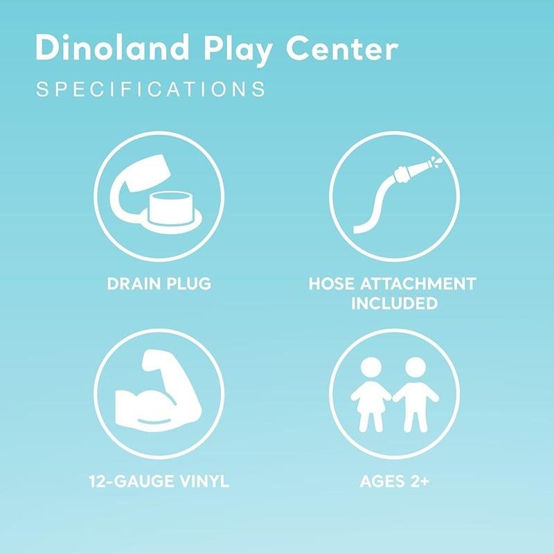 4-in-1 Play Center: Includes water slide, Dino Hoops, Volcanic Ball Roller, and a wading pool.