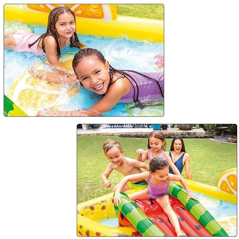 The INTEX Fun 'N Fruity Play Center (57158) is a colorful, fruit-themed water play center designed for endless hours of fun for children aged 2 and up. With a two-in-one design, this vibrant play center features a small pool and a larger pool, allowing kids to enjoy a variety of water activities in one compact setup. Measuring 8ft L x 6ft 6in W x 2ft 4in H when inflated, it is spacious enough to accommodate multiple kids, making it ideal for backyard summer fun. The play center comes with a built-in water slide, an inflatable arch, and delightful themed accessories like a flamingo, a monkey, and a ring toss game with 5 balls for added interactive play. The landing mat provides extra padding for a soft landing as kids slide and play, while the control valve allows you to adjust the water flow for an ideal splash experience. The small pool is designed for younger children with a maximum water height of 4.5 inches, while the larger pool features an 8-inch wall height and has a capacity of 130 gallons of water. The overflow drain hole in the small pool ensures safety for younger children, while the convenient drain plug in the pool floor makes for easy water removal when playtime is over. Designed with 12ga vinyl, this play center is durable and built to last, offering a 178 lb maximum weight limit. Whether it's sliding, splashing, or playing games, the INTEX Fun 'N Fruity Play Center brings the joy of water play to your backyard, ensuring a memorable summer experience for kids.