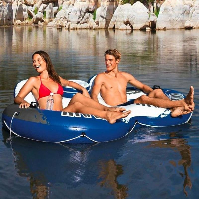 The INTEX RIVER RUN™ 2 - 58837 is the ultimate inflatable water tube for adults looking to relax and float in style. Perfect for the pool or lake, this two-person lounge features comfortable backrests, a mesh bottom for breathability and cooling, and a large built-in cooler with a lid to keep your drinks chilled. Designed for easy cruising, the River Run™ 2 includes two cup holders to keep your refreshments within reach while you float. The tube's construction boasts five air chambers for enhanced safety and durability. With two heavy-duty grab handles and an all-around grab rope, getting in and out of the tube is a breeze. Easy-to-use connectors are also included, allowing you to link the River Run™ 2 to other Intex® River Run™ floats for even more fun. Whether you're floating with a friend or simply enjoying some peaceful relaxation, the INTEX River Run™ 2 offers everything you need for a fun, safe, and comfortable day on the water. The tube has a maximum weight limit of 440 lbs (200 kg), making it suitable for most adults. Measuring approximately 95.5 inches by 62 inches when inflated, this float is large enough for two people to enjoy at once. It also includes a repair patch to ensure long-lasting use, so you can enjoy your River Run™ 2 all season long.