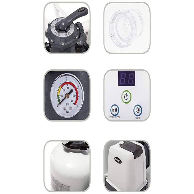 Keep your pool sparkling clean with the INTEX SX1500 Sand Filter Pump, designed to deliver exceptional filtration and efficient water circulation for your swimming pool. Powered by Hydro Aeration Technology, this pump enhances water clarity and promotes better circulation, ensuring your pool remains sanitized and inviting throughout the summer season. The Krystal Clear sand filter pump uses sand as its primary filtration medium, which offers long-lasting performance and requires replacement only once every five years, reducing maintenance efforts and costs. The pump comes equipped with a user-friendly 6-way valve that offers multiple settings, including filtration, backwash, rinse, recirculate, drain, and close, making it versatile and easy to operate. Additionally, the built-in 24-hour automatic timer allows you to set precise operating schedules, optimizing energy use and enhancing convenience. The pump operates on 220-240 V and has a pump flow rate of 5.7 m³/h, with a system flow rate of 4.0 m³/h. Compatible with a variety of pools, including Ultra XTR Rectangular Frame 549x274 cm, Ultra XTR Round Frame 488 cm, and Graphite 478 cm models, this filter pump is an ideal choice for those seeking an efficient, low-maintenance solution for pool care.