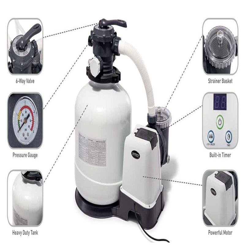 The Intex SX2100 Sand Filter Pump (220-240 Volt) is the ultimate solution to keep your pool water clean, clear, and sanitized with minimal maintenance. Featuring Hydro Aeration Technology, this sand filter pump significantly improves water circulation and enhances filtration for clearer, cleaner water. This pump is specifically designed for above-ground pools, with a high pump flow rate of 2,100 gallons per hour (gph) and a system flow rate of 1,600 gph, making it perfect for pools ranging in size from 2,800 to 12,800 gallons. One of its standout features is the 6-way valve that offers six functions: filtration, backwash, rinse, recirculate, drain, and close, giving you versatility for all your pool maintenance needs. With a built-in 24-hour automatic timer, you can set the pump to run on pre-set cycles of 2 to 12 hours for convenient, hands-free operation. This filter pump includes two 1.5-inch connector hoses, a Hydro Aeration® Technology inlet fitting, and a built-in ground fault circuit interrupter (GFCI) for added safety. The sand filter pump is compatible with larger pool models like the Intex Ultra XTR Rectangular and Round Frame pools. The sand needs to be replaced every five years, saving you time and money on maintenance. Its 0.3 HP motor provides powerful filtration, and its durable 12-inch tank can hold 50 lbs of #20 silica sand or 35 lbs of glass media. The Intex SX2100 Sand Filter Pump is an efficient and reliable option for pool owners seeking high-performance water filtration with minimal effort.