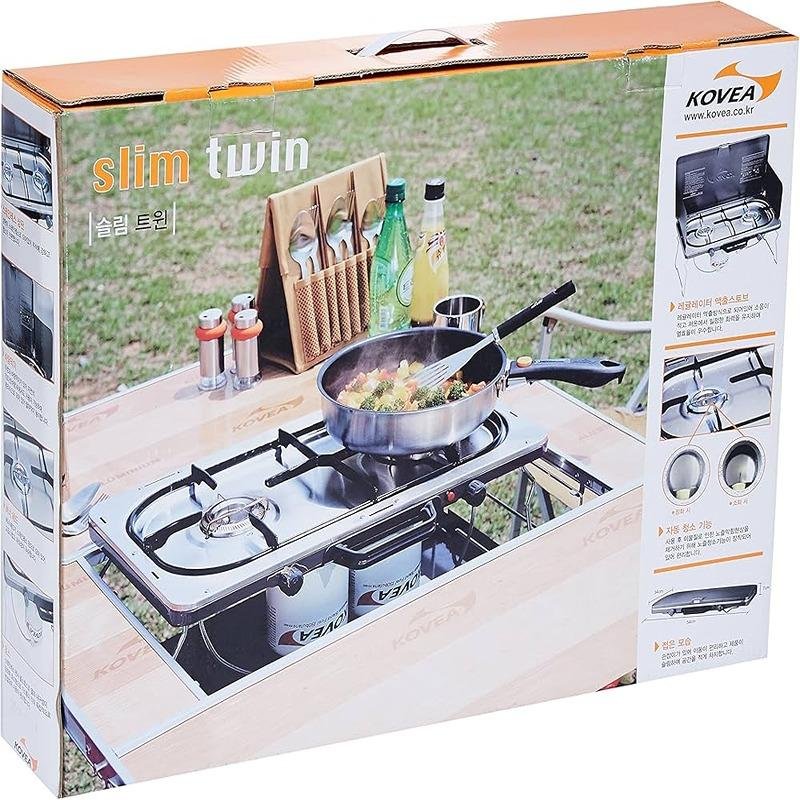 The Kovea KGB-1312A Dual Flame Stove Slim Twin Stove is an exceptional two-burner camp stove designed for outdoor enthusiasts who seek versatility, portability, and superior cooking performance. With its extremely low profile, this stove is lightweight and easy to carry, making it an ideal companion for camping trips, picnics, or tailgating. The unique multi-fuel design includes adapters that allow you to use Butane, Iso-butane, or Propane gases, ensuring you can cook with whichever fuel is available. Each burner has a direct connection, maintaining pressure even when both burners are in use, which guarantees consistent heat distribution and excellent simmer control, similar to a home stove. The stove features a detachable lid, making it suitable for cooking with larger pots and pans, allowing you to prepare family-sized meals with ease. The automatic one-touch Piezo ignition ensures quick and reliable lighting, eliminating the need for matches or lighters. Whether you're boiling, frying, or simmering, this stove offers the convenience of a compact and efficient cooking solution for all your outdoor culinary needs. Weighing only 4.89 kg and folding to a compact size, the Kovea Slim Twin Stove is perfect for those who want both portability and performance in their camping gear.