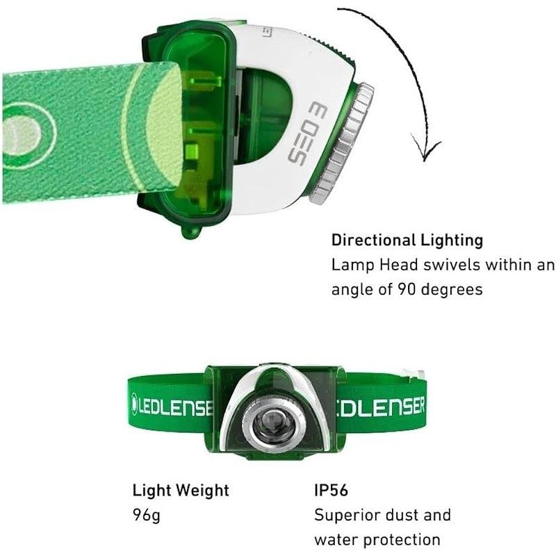 The LL6103 Ledlenser SEO3 in vibrant green is an innovative and versatile headlamp designed for outdoor enthusiasts and professionals alike. This updated version features a powerful 1x C-LED that delivers an impressive brightness of up to 120 lumens, ensuring optimal visibility in various conditions. The headlamp is powered by three AAA batteries, conveniently packaged in a blister for easy access and replacement. With a lightweight design, the SEO3 weighs just 0.09 kg, making it comfortable for extended wear during hiking, camping, or any hands-free lighting needs. The adjustable head strap ensures a secure fit, while the tiltable lamp head allows users to direct light precisely where it is needed. The SEO3 also boasts an IP54 rating, providing protection against dust and splashes, making it suitable for use in challenging environments. Its energy-efficient design extends battery life, allowing for longer usage between replacements. The LED technology ensures a long lifespan for the light source, reducing the need for frequent replacements. With multiple brightness settings, users can easily switch between modes to conserve battery life or maximize illumination based on their specific needs. The compact dimensions of 9.5 cm x 6.5 cm x 4.5 cm make it easy to pack and carry, while the striking green color adds a touch of style to functionality. Whether you are navigating through the wilderness or working in dimly lit spaces, the LL6103 Ledlenser SEO3 is a reliable companion that combines performance, durability, and comfort.