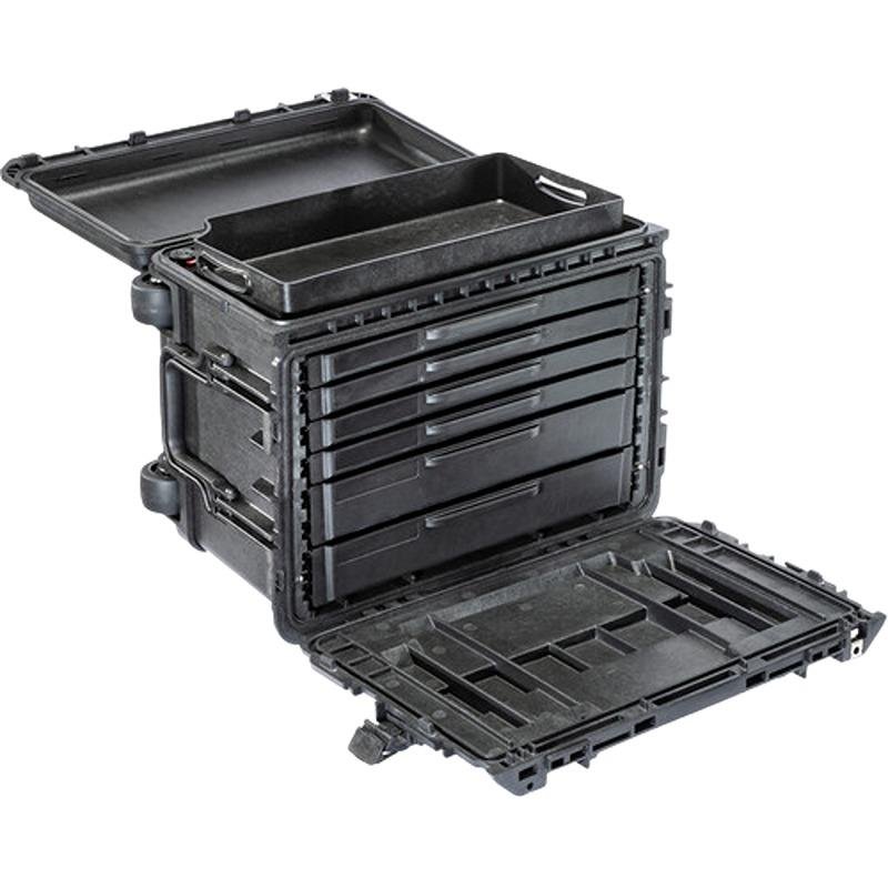 The Pelican 0450SD4 is a robust and versatile storage solution designed for professionals who require reliable organization and mobility for their tools and equipment. This Generation 2 model features an extended length trolley handle that enhances portability, making it easy to transport even in challenging environments. The case has been rigorously tested for water submersion, extreme temperatures, and drop tested from heights of up to 5 feet, ensuring that your tools remain protected under various conditions. The Pelican 0450SD4 includes removable drawers, with options for either six drawers (four shallow and two deep) or seven drawers (six shallow and one deep), allowing for customizable organization based on your specific needs. The aluminum rail slide system ensures smooth operation of the drawers, while the heavy-duty buttress hinges provide added durability. Designed for stability, the wide track mobility allows for easy maneuvering, even when fully loaded. The case is equipped with metal butterfly compression latches that secure the contents, and field-replaceable wheels ensure that maintenance is straightforward. Additionally, the auto pressure equalization valves prevent vacuum lock, making it easier to open the case after changes in altitude or temperature. Whether you are a contractor, technician, or outdoor enthusiast, the Pelican 0450SD4 is engineered to meet the demands of your profession while providing peace of mind that your tools are safe and accessible.