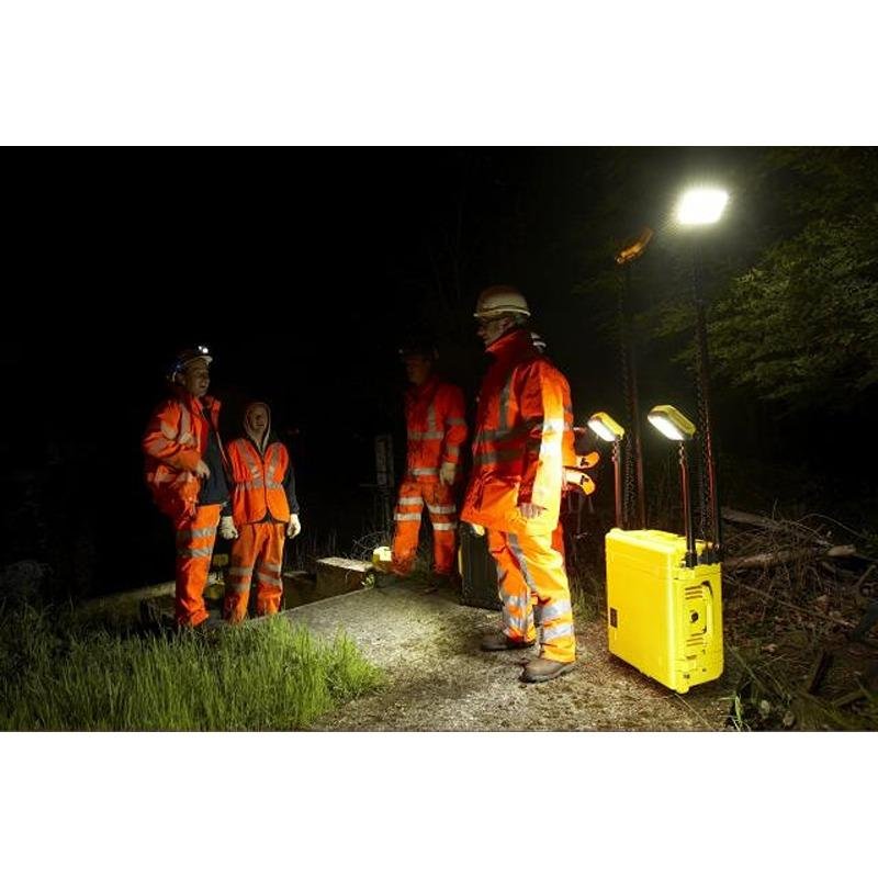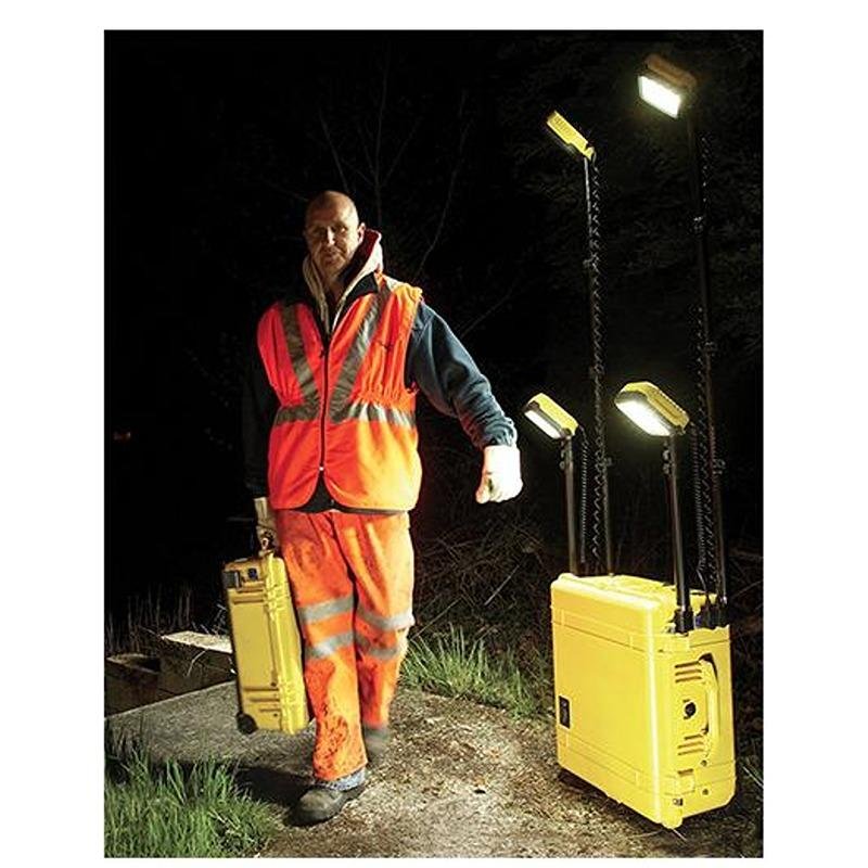 The Pelican 9470 Remote Area Lighting System (RALS) is a cutting-edge lighting solution designed to provide a powerful, eco-friendly alternative to traditional generator-powered lights. Engineered with an Intelligent Control System, the 9470 allows users to monitor battery life and adjust light intensity, ensuring optimal performance tailored to specific needs. With four telescopic masts that extend to nearly 6 feet and four 360° articulating light heads, this system can radiate an impressive 24,000 lumens, with each light head delivering 6,000 lumens. The versatility of the 9470 is further enhanced by its ability to run continuously on wall power, making it ideal for extended applications. Users can keep the unit charged and ready for use at all times. Additionally, the system features a 12-volt power port with a dual USB adapter, allowing for the charging of multiple peripheral devices. Housed in a rugged Pelican case, the 9470 is designed for easy transport, equipped with a retractable pull handle and durable stainless steel ball-bearing polyurethane wheels. This lighting system operates silently, maintains cool temperatures, and produces no exhaust, making it a safe choice for various environments. The Pelican 9470 is also RoHS and CE compliant, ensuring it meets stringent environmental and safety standards.