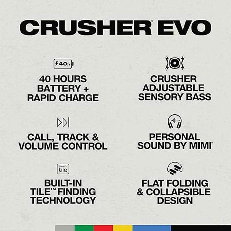The SKULLCANDY Crusher Evo Wireless Over-Ear Headphones (Chill Grey - S6EVW-N744) are engineered to provide a superior audio experience with the revolutionary Crusher Adjustable Sensory Bass, delivering deep, immersive sound that you can personalize to your liking. Whether you're listening to music, watching movies, or gaming, the bass can be adjusted for a truly custom audio experience. In addition to the incredible sound quality, these headphones offer Personal Sound customization via the Skullcandy app, allowing you to tailor the audio profile to your unique hearing preferences. The Crusher Evo boasts an impressive 40-hour battery life, ensuring you can enjoy extended listening sessions without interruption. And when it’s time to recharge, the headphones feature rapid charging that provides hours of playback in just minutes. The built-in Tile™ technology ensures that you’ll never lose track of your headphones—if you misplace them, simply use the Tile app to locate them. For convenience, the Crusher Evo comes with easy-to-use call, track, and volume controls on the earcups, so you can manage your audio without reaching for your device. Designed for both performance and portability, the Crusher Evo headphones are the ideal choice for music lovers who demand premium sound, customizable features, and long-lasting comfort in a sleek, portable package.