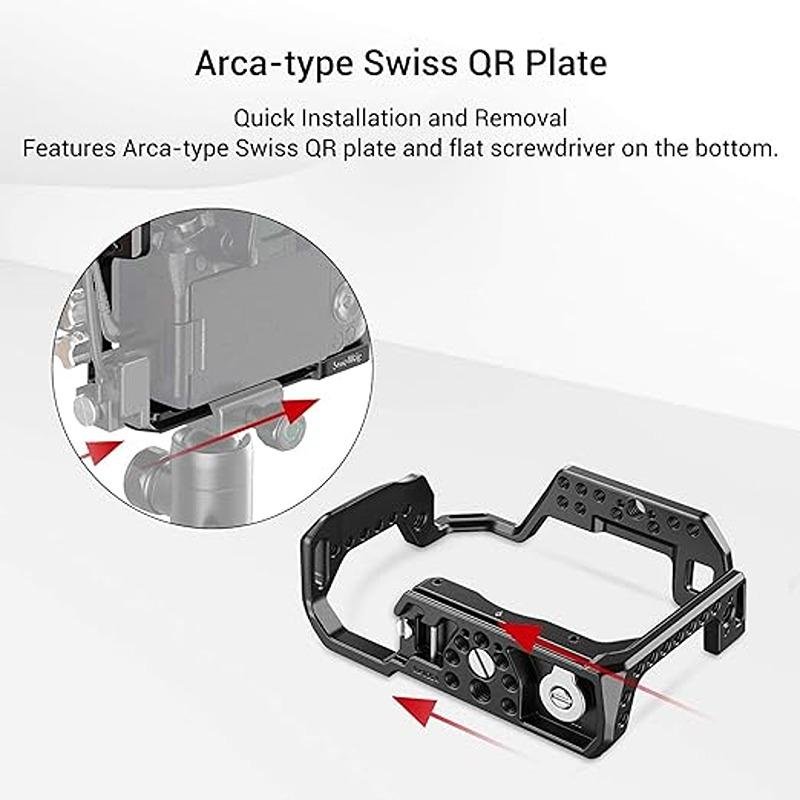 The SmallRig Cage for Canon EOS R (CC2803) is a highly functional and robust accessory designed to provide complete protection and mounting options for your Canon EOS R camera. This cage is tailored to fit the camera perfectly, ensuring no obstruction to the Canon EF R adapter, and features a sensor center line on the base plate to help align the camera with a tripod head for precision. The cage is equipped with multiple accessory mounting points, including 1/4”-20 and 3/8”-16 threaded holes, as well as ARRI 3/8”-16 accessory threads and a cold shoe mount. This allows for the attachment of various accessories such as the SmallRig double-ball head holder 1135, mini ball head holder 761, or the microphone shock absorber mount 1859. The camera can be securely locked into the cage via a 1/4"-20 threaded hole and two anti-twist pins, preventing any accidental disconnections or distractions during use. The bottom of the cage is equipped with a rubber cushion to enhance friction and improve the stability between the cage and the camera. For added convenience, the cage features a quick-release plate that is Arca standard, allowing for seamless attachment to quick-release clamps and base plates such as the SmallRig base plate 2092. With the ability to attach handles like the SmallRig Top Handle 1984 or the SmallRig Side Handle 2093, this cage is ideal for handheld shots. It also includes the option to add the SmallRig cable clamp 1822 to protect HDMI cables and connectors. Designed for both protection and versatility, the SmallRig Cage for Canon EOS R is an essential accessory for any photographer or videographer looking to enhance their Canon EOS R setup.