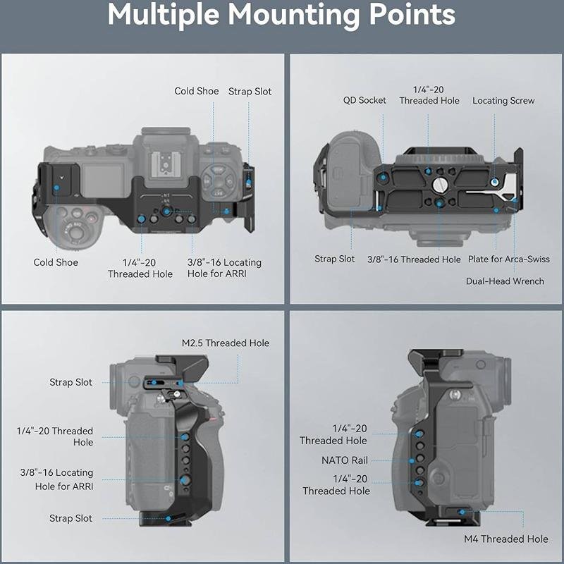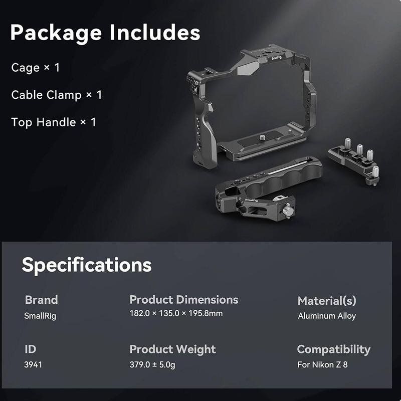 The SmallRig Cage Kit for Nikon Z 8 (3941) is an essential accessory for videographers and photographers seeking stability, protection, and versatility while shooting with the Nikon Z 8 camera. This comprehensive kit includes a custom-designed cage, HDMI cable clamp, and ergonomic top handle, offering a secure and convenient solution for various shooting scenarios. The cage ensures triple protection by locking the camera with a 1/4"-20 screw, a locating screw at the bottom, and an additional screw on the right side to prevent any twisting, keeping your camera stable. For efficient shooting transitions, the Arca-Swiss quick-release plate at the bottom allows for rapid mounting to Arca-type tripods or DJI RS 2 / RSC 2 / RS 3 / RS 3 Pro stabilizers, facilitating quick switches between gimbal and tripod shooting. The built-in magnetic wrench offers a tool-free disassembly process. The ergonomic top handle is designed for comfortable handheld use and enables low-angle shots with ease. The kit also includes multiple mounting points, such as 1/4"-20 threaded holes, 3/8"-16 ARRI locating holes, cold shoes, and NATO rails, making it highly adaptable for a wide range of accessories, including monitor mounts, microphones, and LED lights. The HDMI cable clamp and USB-C cable clamp secure the cables in place with thumbscrews, ensuring signal stability and protecting the interface. This tool-free cable clamp can be easily assembled or disassembled for added convenience. With its robust build, the SmallRig Cage Kit for Nikon Z 8 is perfect for those looking for both a secure camera cage and versatile accessory mounting options, all while maintaining quick and efficient shooting capabilities.