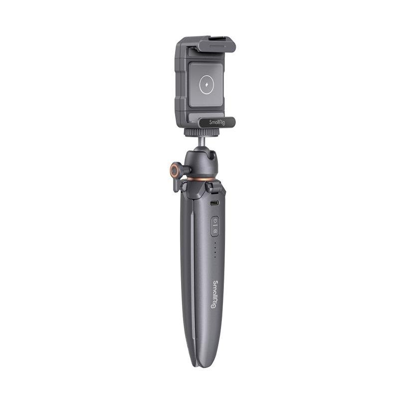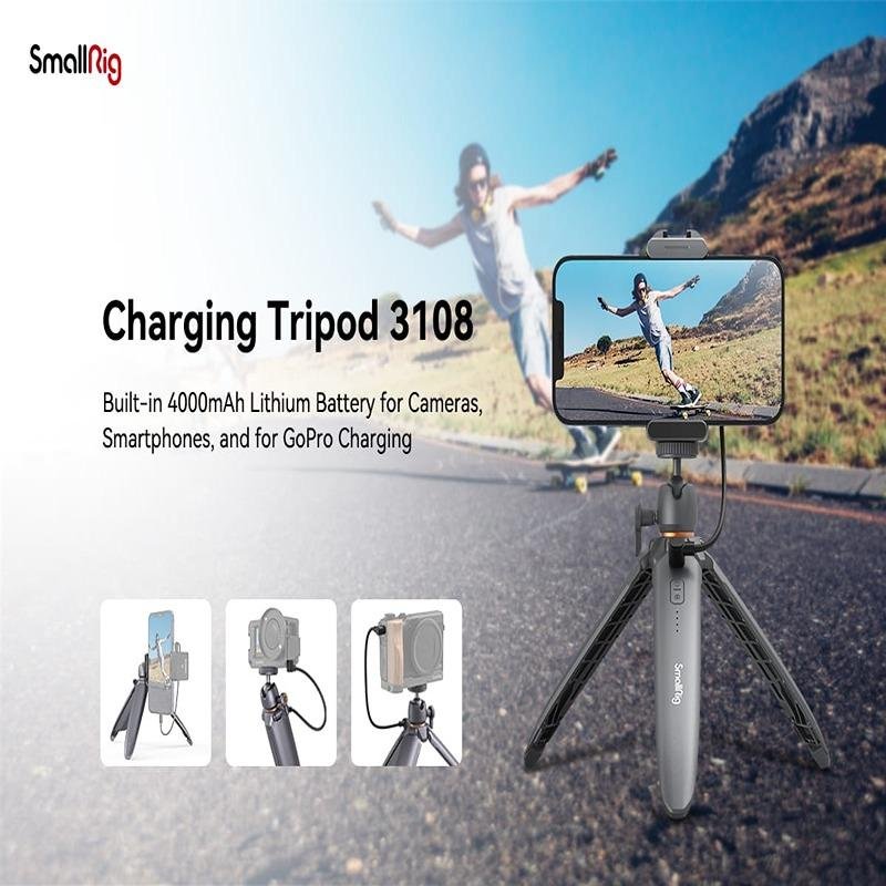 The SmallRig Charging Tripod 3108 is a versatile and innovative tool designed for smartphone videography. This tripod combines a functional tripod stand with a built-in charging solution, offering users a stable platform for shooting while keeping their devices powered. Featuring a non-detachable lithium battery with a battery indicator, it supports both power input and output via a USB-C port, ensuring your mobile devices stay charged during extended shooting sessions. The tripod also includes a wireless module that allows for convenient start/stop control of recording, enhancing the user experience without the need for manual intervention. Its tripod legs are equipped with a silicone anti-slip pad for stability, and the unit can be folded for use as a handle, providing a comfortable grip for handheld filming. The head of the tripod swivels 360° and tilts ±90°, allowing for flexible camera angles. The wireless charging holder, compatible with devices ranging from 62.5mm to 98mm in width, supports Qi wireless charging for smartphones, even with a phone case on. Additionally, it features a cold shoe mount for attaching accessories like microphones or LED lights and a 1/4"-20 threaded hole for easy tripod mounting. The SmallRig Charging Tripod 3108 is an excellent solution for content creators who need a portable, multi-functional tripod that keeps their devices charged while supporting various accessories for a professional-grade shooting experience.
