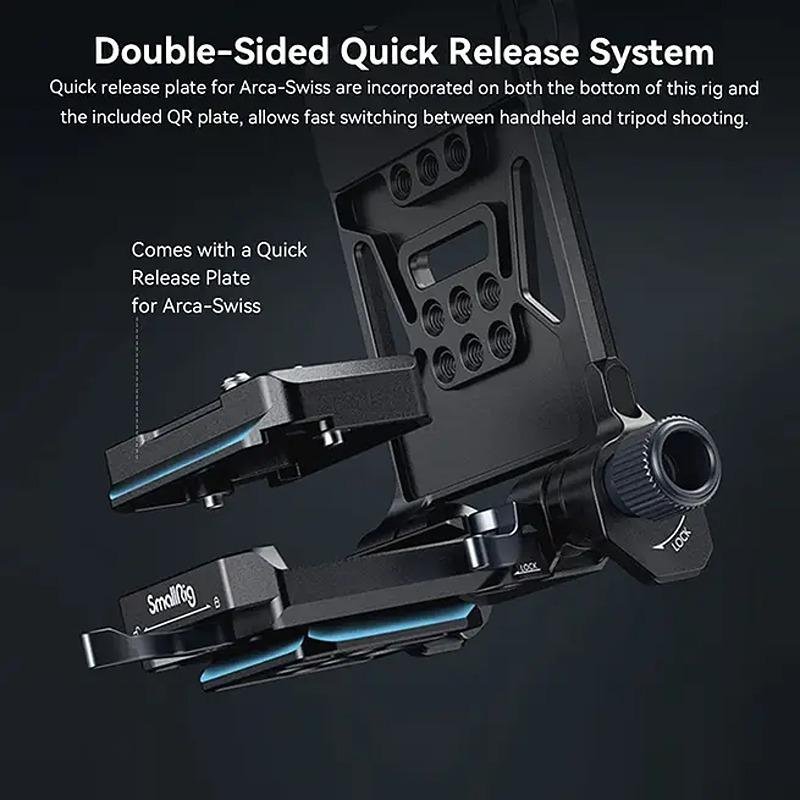 The SmallRig Compact V-Mount Battery Mounting System 4064 is a versatile, lightweight, and compact all-in-one solution for powering camera rigs with a V-mount battery. Featuring an L-shaped design, this system offers quick installation and adjustment for both the camera and the battery. The stretchable baseplate, with a maximum extension of 36.5mm, accommodates different camera sizes and enhances compatibility. The toggle lock allows for easy locking and release of the rod, eliminating the need for tools and making setup fast and efficient. On the bottom, the mount features a 1/4"-20 and 3/8"-16 quick-release plate compatible with Arca-Swiss, providing seamless switching between handheld shooting, gimbal setups, and tripod mounts. A key design feature of the V-mount battery plate is its 90° rotation capability, enabled by a thumb lock that allows the camera’s flip screen to open without removing the battery. This rotatable structure not only saves time but also ensures safety with pivot dampening that prevents equipment from falling. Additionally, the V-mount battery plate includes a mini V-mount plate with 1/4"-20 threads, making it compatible with NP-F battery adapter plates and power bank holders, thus offering more flexible power solutions. Whether you are filming on a tripod, handheld, or using a gimbal, the SmallRig Compact V-Mount Battery Mounting System 4064 provides an adaptable and reliable power source for your camera rig.