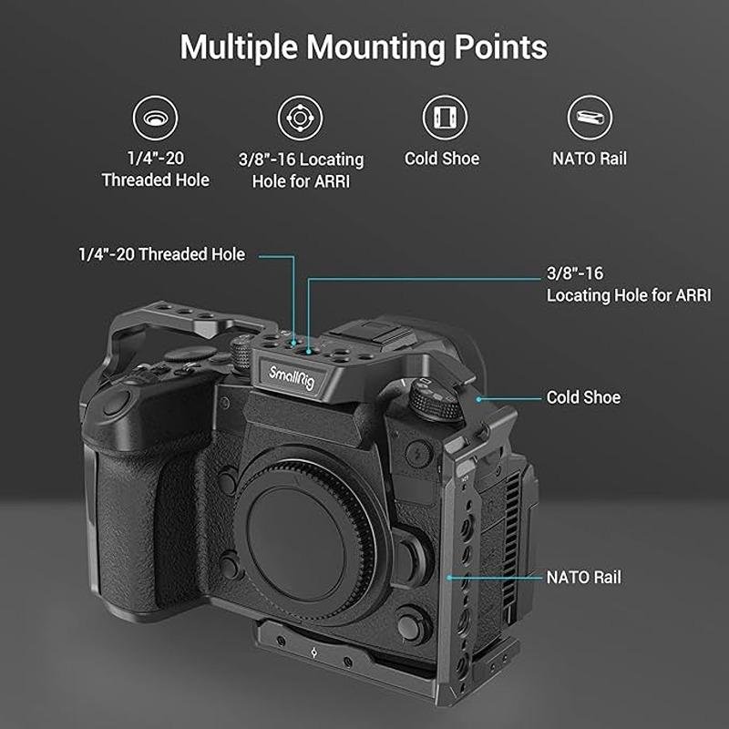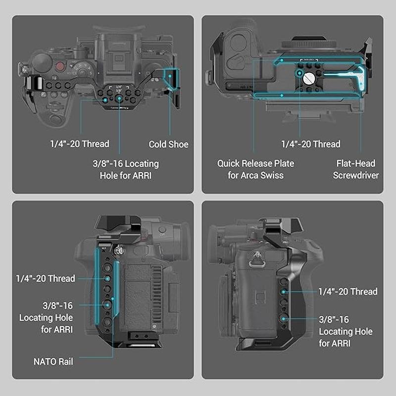 The SmallRig Full Camera Cage for Panasonic LUMIX GH6 (3784) is a premium accessory designed to offer comprehensive protection and versatility for your camera. Constructed from high-quality aluminum alloy, stainless steel, and silicone, this cage provides a durable yet lightweight solution that ensures the safety of your Panasonic LUMIX GH6 against impacts and scratches. Its all-in-one form-fitting design offers a snug fit around the camera, while the rubber pads protect the body from scratches and damage. The cage features a secure anti-twist two-point locking system, consisting of a 1/4"-20 screw and an M2.5 screw, which prevents unwanted rotation and ensures a stable setup. For added flexibility, it is equipped with various mounting options, including 1/4"-20 threaded holes, an ARRI 3/8"-16 locating hole, cold shoe mounts, and a NATO rail, allowing you to attach accessories such as a handle, microphone, LED light, or monitor. The built-in Arca-Swiss quick release plate provides seamless integration with Arca-Swiss tripods, making it ideal for tripod-based photography. Additionally, the cage includes a magnetic spanner for easy access during assembly and disassembly, streamlining your workflow. Whether you're a professional videographer or photographer, the SmallRig Full Camera Cage for Panasonic LUMIX GH6 enhances your shooting experience by offering reliable protection, versatile accessory mounting, and stability for your camera setup.