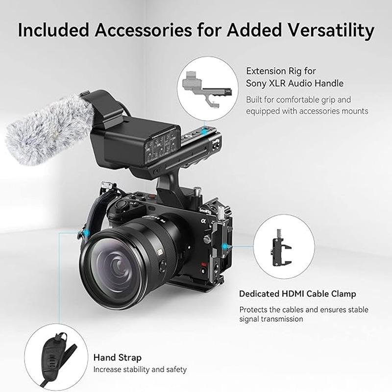 Includes a cage, HDMI cable clamp, XLR handle extension rig, and hand strap
