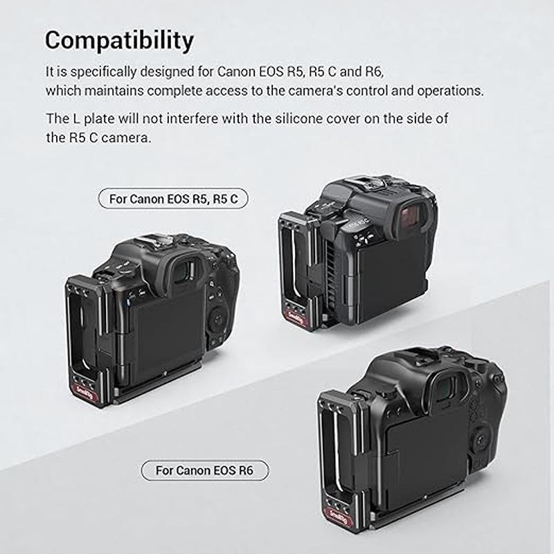The SmallRig L-Bracket for Canon EOS R5 and R6 (2976) is a high-quality and versatile mounting solution designed to provide greater flexibility and stability for your camera setup. Specifically tailored for the Canon EOS R5, R6, and R6 Mark II, this L-bracket ensures secure and precise attachment with its 1/4”-20 screw on the camera base, preventing any wobbling thanks to an added anti-twist pin. Ideal for photographers and videographers, this bracket allows for quick orientation changes between horizontal and vertical shooting without the need to remove the camera from the tripod or gimbal. Both the side plate and base plate are Arca-compatible, ensuring quick and seamless transitions between different setups. The L-bracket is carefully designed to fit the Canon EOS R5 and R6 models, with no interference to the buttons, ports, LCD screens, or battery switches. Additionally, the side plate is extendable by 22.5mm, offering extra space for cable management, ideal for preventing cables from interfering with your shooting. The bracket also includes 1/4”-20 accessory threads, which enable you to attach additional accessories like the SmallRig cable clamps (2259 for EOS R5, 1822 for EOS R6) or a cold shoe mount (BUC2736). Lightweight and durable, the SmallRig L-Bracket 2976 is perfect for users seeking a solid, well-designed, and flexible solution for their Canon EOS R5 and R6 cameras.