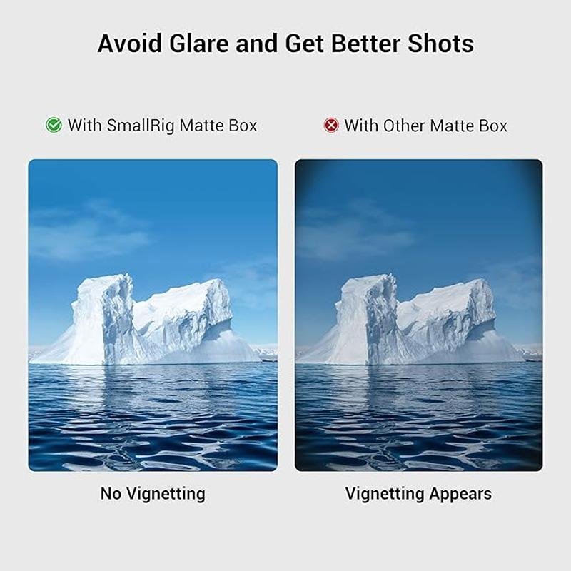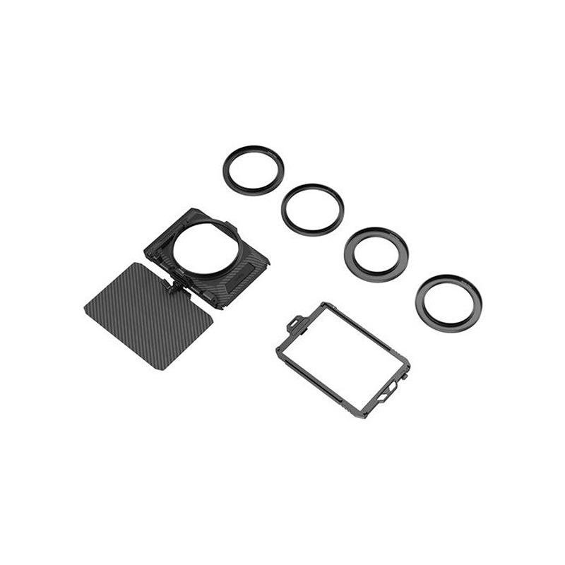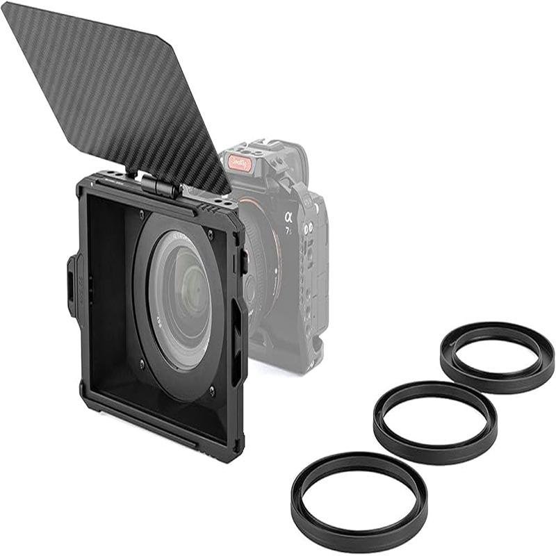 The SmallRig Mini Matte Box 3196 is a compact and lightweight solution designed to help photographers and videographers control glare and flare while maintaining the quality of their footage. Made from durable carbon fiber material, this matte box is compatible with both DSLR and mirrorless cameras, providing a secure and efficient way to attach filters. It accepts multiple 4 x 5.65" filters and includes one filter tray and four adapter rings to attach the matte box to the lens, with a maximum load capacity of 2.2 lb. The matte box features a carbon fiber top flag that blocks sunlight and other strong light sources, preventing reflections from affecting the lens. The flag is adjustable and can be folded down to protect the lens when not in use. Designed for maximum flexibility, it includes multiple 1/4"-20 threads on the top for attaching accessories and also supports mounting on 15mm LWS rods using an optional 15mm LWS rod clamp. Additionally, the filter tray can be easily mounted via a NATO clamp, allowing for quick adjustments and secure installation of round filters and 4 x 5.65" filters up to 4mm thick. The filter tray is designed with multi-point silicone protection, ensuring that your filters are safe from scratches and fingerprints. This matte box is ideal for users seeking a portable yet versatile solution for their camera rig, offering wide compatibility with various lenses and filters while maintaining a sleek and professional appearance.