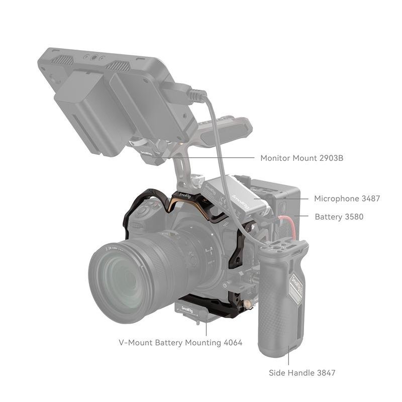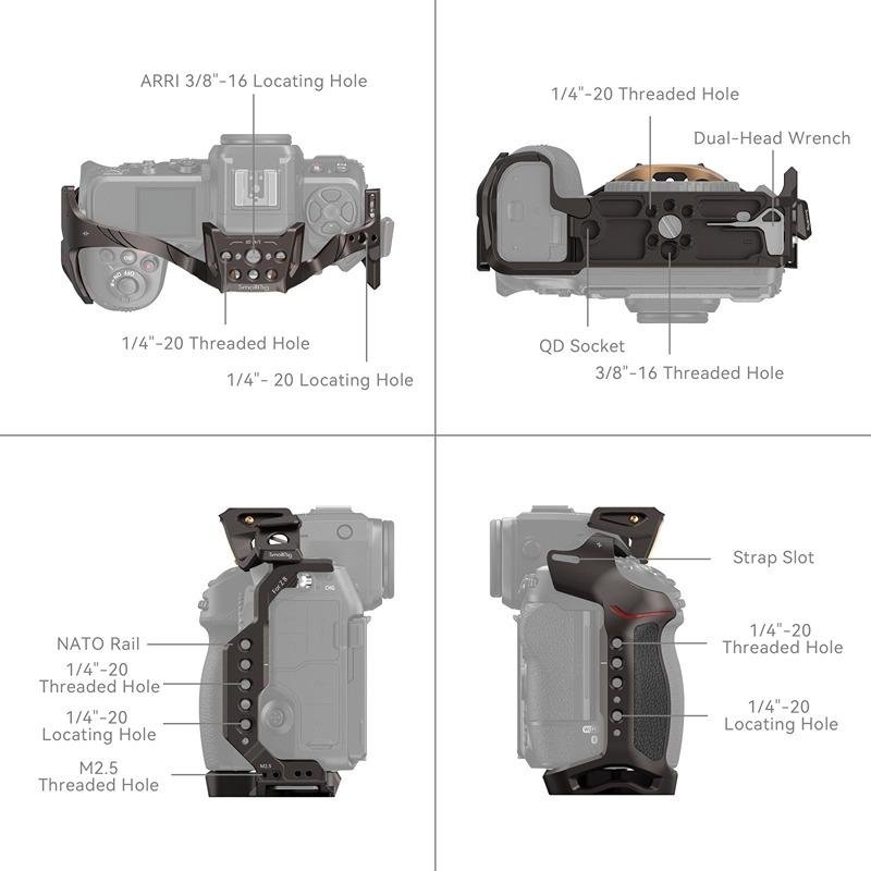 The SmallRig “Night Eagle” Cage for Nikon Z 8 (4316) is a visually striking, innovative camera cage that combines style, functionality, and protection for your Nikon Z 8 camera. Featuring a brand-new design with gun brown curved surfaces enhanced by golden lines, the cage aesthetically echoes the distinctive elements of the Nikon Z 8, including the gold ring, red marks, and retro leather accents, giving it a unique, high-end look. This cage not only delivers superior protection to your camera but also offers extensive compatibility with a wide range of accessories, ensuring your setup can be customized to suit your specific needs. The cage is equipped with multiple mounting options such as 1/4"-20 threaded holes, 3/8"-16 threaded holes, ARRI 3/8"-16 locating holes, NATO rail, and QD socket, enabling the attachment of monitors, microphones, LED lights, and other accessories. The detachable cold shoe allows you to add extra devices like an LED video light or microphone with ease. For secure and convenient mounting, the cage includes an integrated Arca-Swiss quick-release plate that allows you to easily attach your camera to Arca-type tripods or DJI RS 2 / RSC 2 / RS 3 / RS 3 Pro gimbals, facilitating smooth transitions between different shooting setups. With its ergonomic design and functional features, the “Night Eagle” Cage not only provides enhanced grip and control but also ensures that all buttons, ports, and slots are fully accessible, enabling an uninterrupted shooting experience.