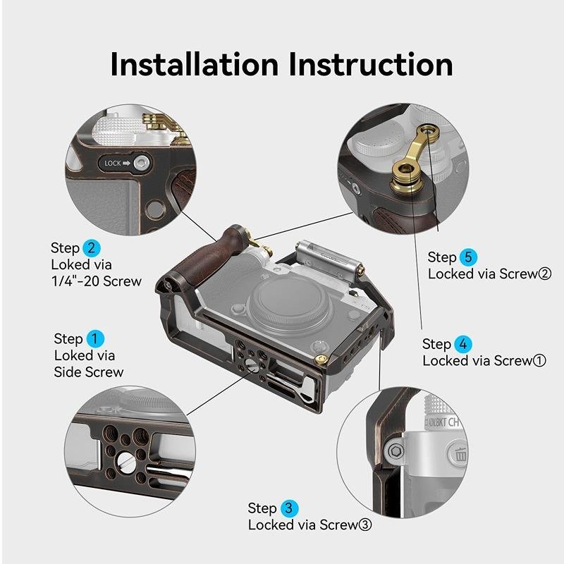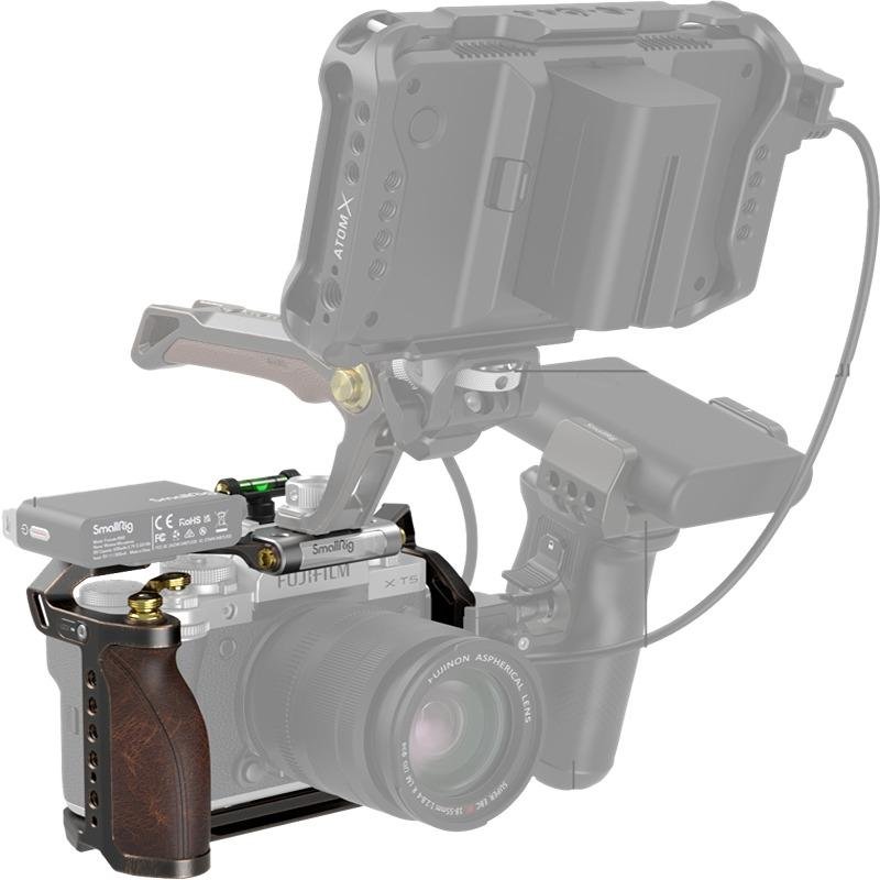 The SmallRig Retro Cage for FUJIFILM X-T5 (3870) is a uniquely designed camera cage that combines both vintage aesthetics and modern functionality, offering a stylish and practical solution for protecting your FUJIFILM X-T5. The cage is crafted from a black titanium material with bronze edges and gold rivets, providing an elegant, classic appearance that stands out. The metallic rust and leather brown color, paired with hand-rubbed edges and expert craftsmanship, give it a truly unique look. The ergonomic cowhide leather handle not only adds to the retro appeal but also enhances your grip and shooting experience, ensuring comfort during extended use. For added convenience, the shutter button adapter improves shutter control, making it easier to capture precise shots. The hot shoe cover features a built-in bubble level, ensuring your camera is perfectly aligned for accurate shots. With multiple accessory mounting points, including 1/4"-20 threaded holes, 3/8"-16 threaded holes, ARRI 3/8"-16 locating holes, a cold shoe mount, and NATO rail, this cage offers the flexibility to adapt to various shooting environments and needs. The cage’s lightweight yet durable construction ensures that your camera is well protected while maintaining ease of use in a variety of shooting situations. Whether you're working with handheld setups or attaching additional accessories like microphones and monitors, the SmallRig Retro Cage provides all the mounting options and protection you need in a stylish, high-quality package.