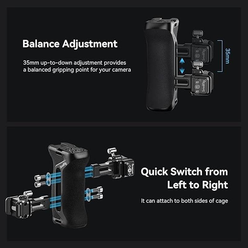The SmallRig Snap-on Quick Lock NATO Side Handle 4017 is an essential accessory for camera rigs, designed to provide improved stability and ease of use during handheld filming. This versatile handle can be mounted on either the right or left side of your rig, offering flexibility for different shooting preferences. The quick-locking NATO clamp allows for swift attachment and detachment without the need for tools, making it convenient for fast-paced production environments. Additionally, the handle features 1.4 inches of vertical adjustment, allowing you to fine-tune the positioning for maximum comfort. For added functionality, the handle comes equipped with 1/4"-20 threaded holes for mounting accessories, as well as a cold shoe mount for attaching microphones or lights. A wrist strap slot is also included for securing the rig to your body for better stability and control. The handle boasts a remarkable 26.4 lb load capacity, ensuring it can support your gear with confidence. The built-in magnetic Allen key provides quick and easy access for adjustments, making the handle even more user-friendly. Whether you're shooting on a gimbal, tripod, or handheld, the SmallRig Snap-on Quick Lock NATO Side Handle is the perfect addition to your camera rig, offering improved comfort, stability, and versatility for your filming needs.