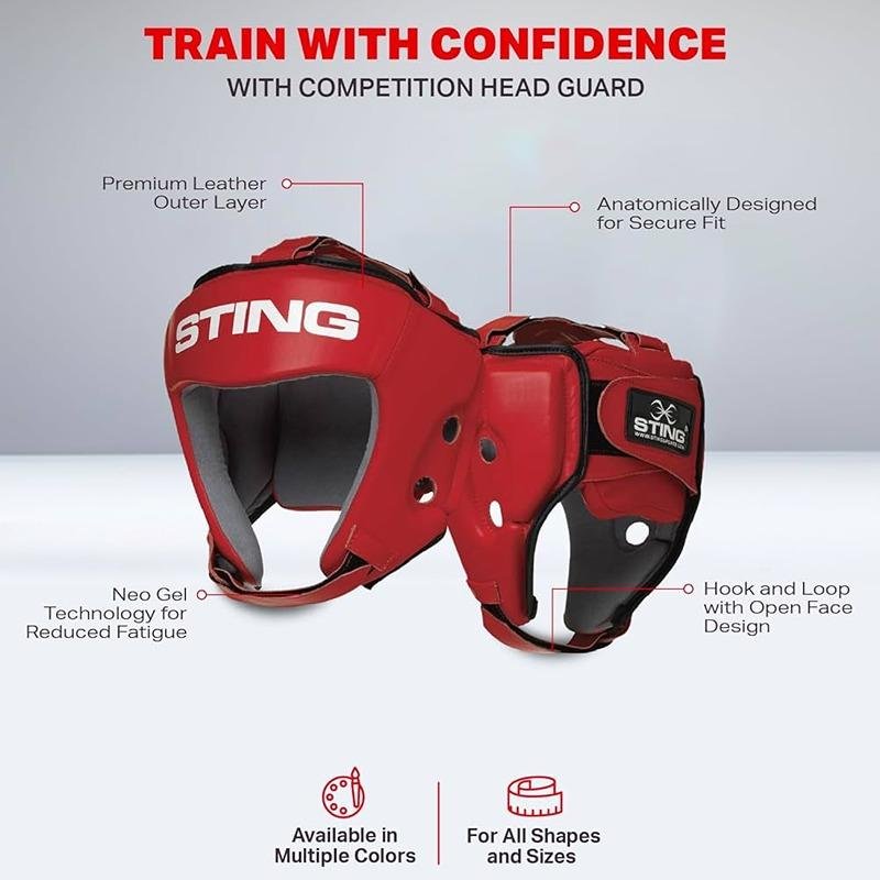 The STING COMPETITION AIBA HEAD GUARD - S2AH-0302 is designed to meet the highest standards of safety and performance for competitive boxers participating in AIBA-sanctioned events. This head guard incorporates advanced Neo-Gel Fusion Technology, offering superior shock protection and minimizing the impact of strikes to the head. The premium leather hide outer layer ensures durability and resilience, making it ideal for frequent use in training and competition. Crafted according to AIBA guidelines, the head guard features a precision design that provides optimal protection without compromising on comfort or mobility. The anatomically designed structure ensures a secure fit, effectively minimizing slippage during fast movements. The innovative Neo-Gel technology absorbs and disperses shock, while Gel Fusion technology further enhances energy management, helping reduce the risk of fatigue and ensuring increased endurance throughout the fight. The high levels of padding on the brow area offer added protection, reducing the risk of cuts and bruises while maintaining clarity of vision. Perfect for competitive boxers, this head guard guarantees maximum protection and comfort, allowing athletes to focus on their performance with confidence.