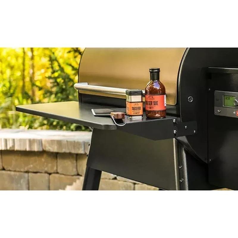 The TRAEGER FOLDING SHELF - IRONWOOD 885, PRO 780 - BAC564 is the perfect upgrade for your Traeger grill, adding extra space for your grilling tools, beverages, and food prep items. Crafted from 100% durable steel, this folding front shelf provides 32.5" L x 11.6" W of additional workspace, making it perfect for setting down a cold drink, placing a cutting board, or organizing your BBQ utensils while you grill. This shelf is designed to easily fold down when not in use, allowing for more compact storage and ensuring that you can still fit a grill cover over your grill without issue. Installation is simple, and the shelf seamlessly integrates with your existing setup, offering practical and efficient use of space without compromising on style. It’s specifically designed to fit Traeger Pro 780 and Ironwood 885 Series models, providing a sturdy and reliable surface for all your grilling needs. Whether you’re prepping food or need a place to keep your grilling essentials handy, the folding shelf expands your grilling experience, keeping everything organized and within easy reach.