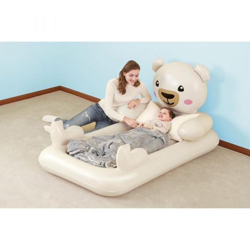 The Bestway BWAY AIRBED TEDDY BEAR 188X109X89 - 67712 is an adorable and functional inflatable bed designed to delight children while providing comfortable sleeping space. Measuring 188×109×89cm (74"×43"×35"), this charming teddy bear-shaped air mattress features a soft, flocked sleeping surface with the bear's friendly face design that makes bedtime fun. The generous 89cm height creates a true bed-like experience, while the surrounding raised edges provide safety and prevent roll-off for young sleepers. Constructed from durable, phthalate-free PVC, this airbed supports up to 150kg (330 lbs) and includes a built-in AC pump that inflates the mattress in just 3 minutes. The playful teddy bear design with embroidered details sparks imaginative play during the day and offers cozy comfort at night, making it perfect for sleepovers, playdates, or transitioning from crib to bed. The non-slip bottom keeps the mattress securely in place, while the easy-deflate valve allows for quick storage in the included carry bag. Unlike standard air mattresses, this whimsical design combines the functionality of a guest bed with the appeal of a giant plush toy, creating a sleep solution that children will love. Whether used for everyday sleep or special occasions, the Teddy Bear airbed transforms any space into a fun and comfortable sleeping area while helping children develop positive sleep associations.