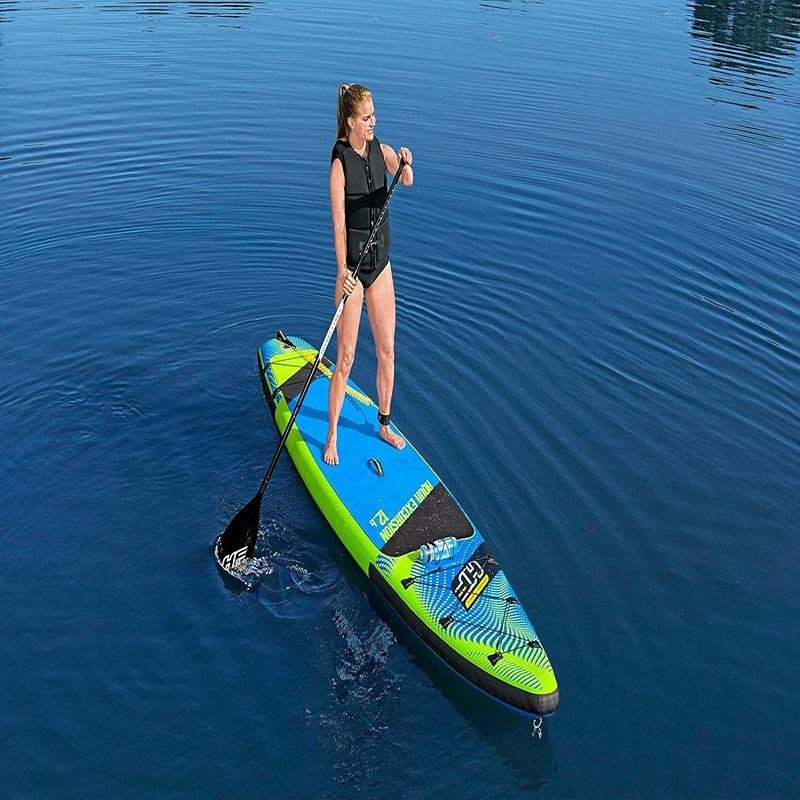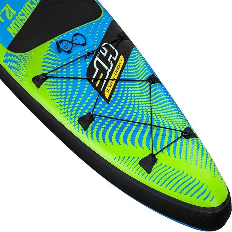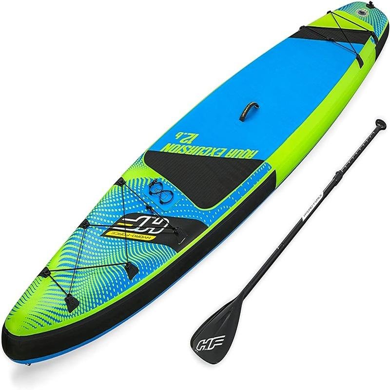 The Bestway BWAY Hydro-Force Aqua Excursion Set 381x79x15 – 65373 is a high-performance inflatable stand-up paddleboard (SUP) designed for enthusiasts who love long rides on calm waters. Perfect for flat water touring, this set features an ideal size of 381 cm in length, 79 cm in width, and 15 cm in thickness (12 ft. 6 in. x 31 in. x 6 in.) to provide a stable and efficient paddling experience. Constructed with triple-layer laminated drop-stitch material, the Aqua Excursion SUP combines the portability of an inflatable with the strength and rigidity of a hard-sided board. The board's weight capacity of 120 kg (265 lbs) ensures it can accommodate most users comfortably. For added convenience, the set includes a removable fin, making storage easier while enhancing the board’s stability in the water. The board also features a non-slip traction pad, ensuring a secure grip during use, and an elastic cord to store additional gear while on the water. The Aqua Excursion Set comes complete with all necessary accessories, including a paddle, hand pump, deluxe backpack, coiled leash, fin, and repair kit, ensuring that you have everything you need for an enjoyable experience. A bottle holder with an adjustable elastic band is provided, allowing you to keep your beverages within reach during long excursions. The convenient deck handle makes carrying the SUP a breeze, even when fully inflated. Whether you're a seasoned paddler or new to the sport, the Bestway Hydro-Force Aqua Excursion Set 381x79x15 – 65373 offers the ideal combination of stability, performance, and convenience for those seeking adventure on the water.
