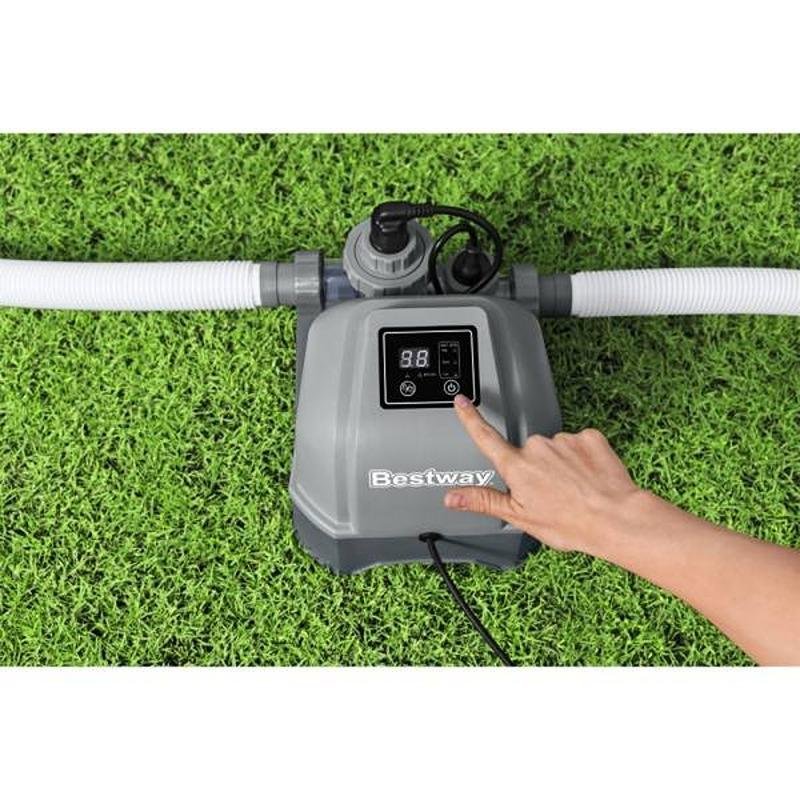 The Bestway BWAY HYDROGENIC SALTWATER CHLORINATOR (Model 58678) is an advanced water sanitation system that transforms ordinary salt into chlorine to keep your pool clean and safe. Designed for above-ground pools up to 26,500 liters (7,000 gallons), this innovative system measures 28 x 22 x 18 cm and weighs 2.5 kg, featuring a compact design that integrates seamlessly with your existing filtration system. The hydrogenic technology efficiently converts dissolved salt (2,500-4,500 ppm) into pure chlorine through electrolysis, eliminating the need for traditional chlorine tablets or liquid. The digital control panel allows precise adjustment of chlorine output from 1-10 levels, with an automatic reverse polarity function that prevents scale buildup and extends cell life. The self-cleaning titanium electrolytic cell requires minimal maintenance and lasts up to 7,000 hours of operation, while the clear view cell chamber lets you monitor saltwater flow and chlorine production. The system operates on 120V power and features a built-in flow sensor that automatically shuts off if water circulation stops for safety. The corrosion-resistant housing withstands harsh pool environments, and the simple push-button controls make operation intuitive. This chlorinator reduces eye and skin irritation compared to traditional chlorine systems while maintaining water that's 99.9% free of harmful bacteria and algae. The included salt level indicator helps maintain optimal salinity, and the energy-efficient design adds only minimal cost to your pool operation. Easy to install with standard 38mm hose connections, the system works in harmony with your filter pump to provide continuous sanitation. When not in use, the compact unit stores easily, making it ideal for seasonal pool owners. With its combination of advanced technology, user-friendly features, and low maintenance requirements, the Bestway Hydrogenic Saltwater Chlorinator provides a healthier, more enjoyable swimming experience while reducing chemical storage and handling.
