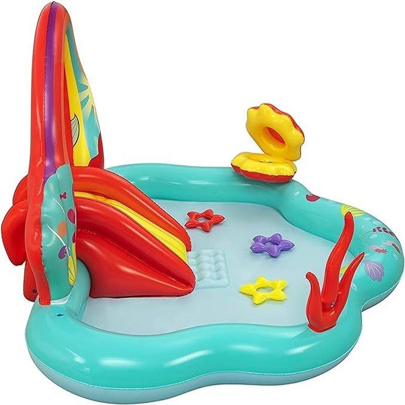 The Bestway BWAY Playcenter Little Mermaid 221x193x117 cm (Model 91097) brings a wave of magical underwater adventure to your backyard, offering hours of fun and imaginative play for young Disney fans. With an enchanting Little Mermaid theme, this inflatable play center is designed to entertain and delight children through a range of activities and features that keep them engaged and active. The colorful and detailed design captures the spirit of Ariel’s underwater kingdom, featuring inflatable sea creatures, arches, and play elements that make playtime feel like a real ocean adventure. The built-in water sprayer connects easily to a garden hose, creating a refreshing splash zone perfect for hot summer days. Crafted from sturdy pre-tested vinyl, the play center is designed for safety and durability, offering a soft landing surface for jumps and tumbles. It includes an inflatable slide with a cushioned bottom for safe sliding fun, and a shallow splash pool area that lets kids cool off while they play. Ideal for children aged 2 and up, the playcenter promotes physical activity, coordination, and creativity through imaginative role-playing. Parents will love the easy setup and takedown, as the inflatable structure is quick to fill and deflate, and compact enough to store when not in use. Whether it’s for a backyard party, a weekend treat, or everyday outdoor play, the Bestway BWAY Playcenter Little Mermaid turns any space into a magical aquatic playground that brings smiles, laughter, and unforgettable memories