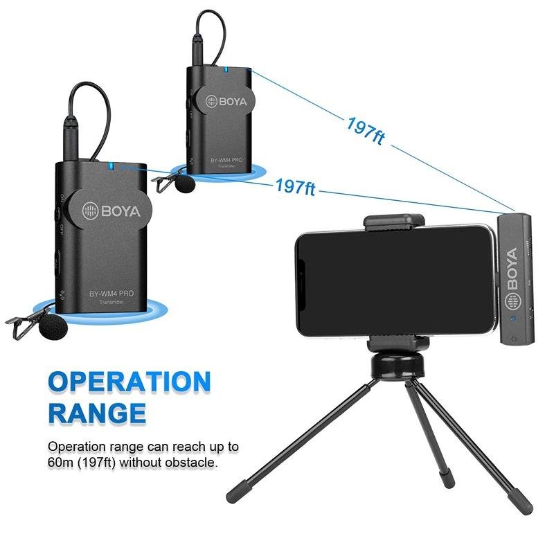 The Boya BY-WM4 Pro-K6 is a high-quality 2.4GHz wireless microphone system designed specifically for Android devices and other Type-C compatible devices. Ideal for a variety of applications including YouTube videos, vlogging, podcasts, mobile journalism, and live streaming, this system offers exceptional performance and clarity. Operating on the 2.4 GHz digital frequency band, the Boya BY-WM4 Pro-K6 ensures stable and interference-free wireless audio transmission. The system features a dual-channel receiver, allowing for two microphones to be used simultaneously, which is perfect for interviews, discussions, or collaborative content creation. The receiver itself is ultracompact and miniature in size, making it incredibly portable and easy to use, while still providing superb sound quality. With a range of up to 60 meters (197 feet) without obstacles, this system provides flexibility and freedom to move around while recording. The system also includes a 3.5mm headphone output for monitoring sound in real time, ensuring your recordings are always clear and accurate. A master volume control enables you to adjust the audio levels to suit your recording needs. Additionally, the system offers selectable stereo and mono modes (for BY-WM4 RXD/RXU), allowing you to tailor the audio capture for your specific needs. The included omnidirectional lavalier microphone ensures clear sound capture from all directions, making it perfect for any recording environment. The system also comes with a hard case for easy storage and transport, protecting your gear while you're on the go. Whether you're recording a podcast, doing an interview, or creating content for social media, the Boya BY-WM4 Pro-K6 is the ideal wireless microphone system for Android and Type-C devices.