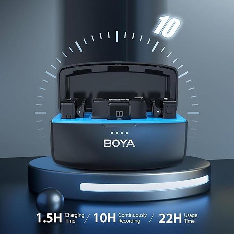 The Boya MIC 2.4GHz all-in-one professional wireless microphone system is designed to provide high-quality, wireless audio recording for a range of devices including cameras, iPhones, and Android phones. Offering seamless connectivity with 2.4GHz wireless technology, it ensures crystal-clear sound for vlogging, podcasting, interviews, and live streaming. The microphone system is easy to set up and features a user-friendly plug-and-play design, making it an excellent choice for both beginners and professionals. With a charging time of just 1.5 hours, the system offers a remarkable 22 hours of usage and 10 hours of continuous recording time, ensuring long-lasting performance during extended recording sessions. The built-in noise reduction feature enhances the audio quality, minimizing background interference and ensuring clean, professional-grade sound. Compatible with various devices, the Boya MIC is ideal for content creators on the go. Whether you're recording interviews, podcasts, or videos, this wireless microphone system provides the flexibility and convenience you need. Its compact design and lightweight build make it portable and easy to carry, while its reliable wireless range gives you the freedom to move around while maintaining excellent sound quality. This all-in-one microphone system is a powerful solution for anyone who needs high-performance wireless audio recording without the hassle of complicated setups.